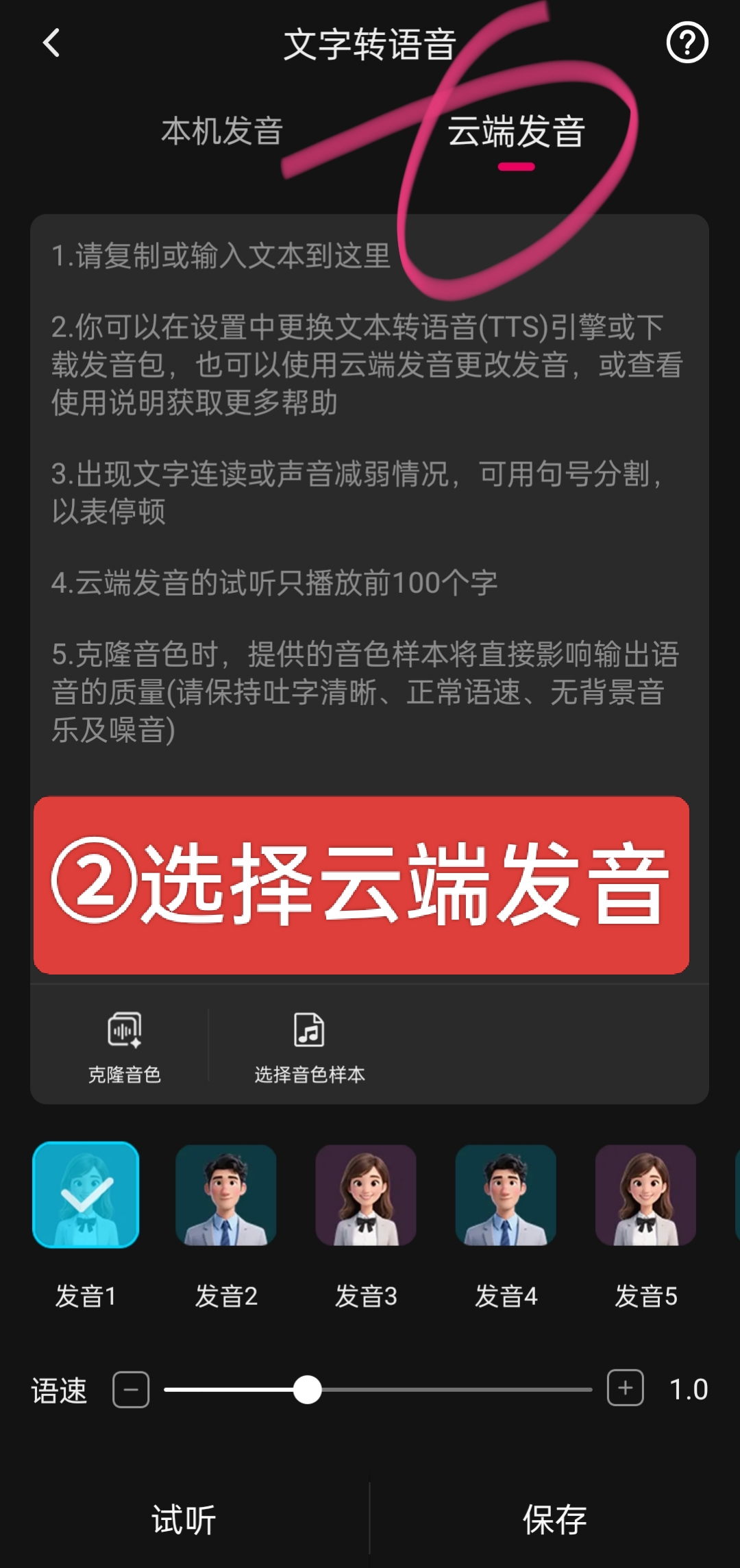 调整【语速】至1.0倍速,点击【试听】检查效果。