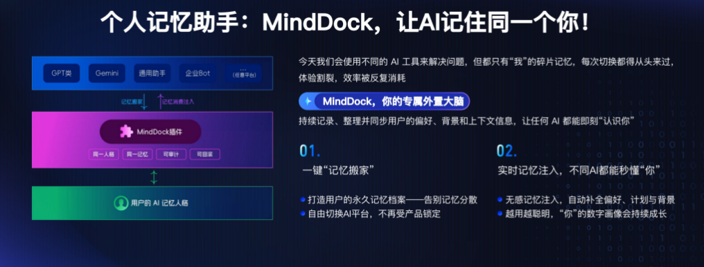 11月27日,记忆张量推出的MemOS-MindDock,首次解耦AI记忆与平台能力。通过“记忆与平台的解耦”,让用户成为记忆资产的主人,构建起不依附于任何平台、可持续沉淀的用户侧记忆体系。跨平台同步只是其外在表现形式,核心是为用户打造了一份“永不丢失、持续增值、完全自主”的记忆资产,最终实现从“碎片化AI交互”到“连续性智能体验”的本质飞跃。