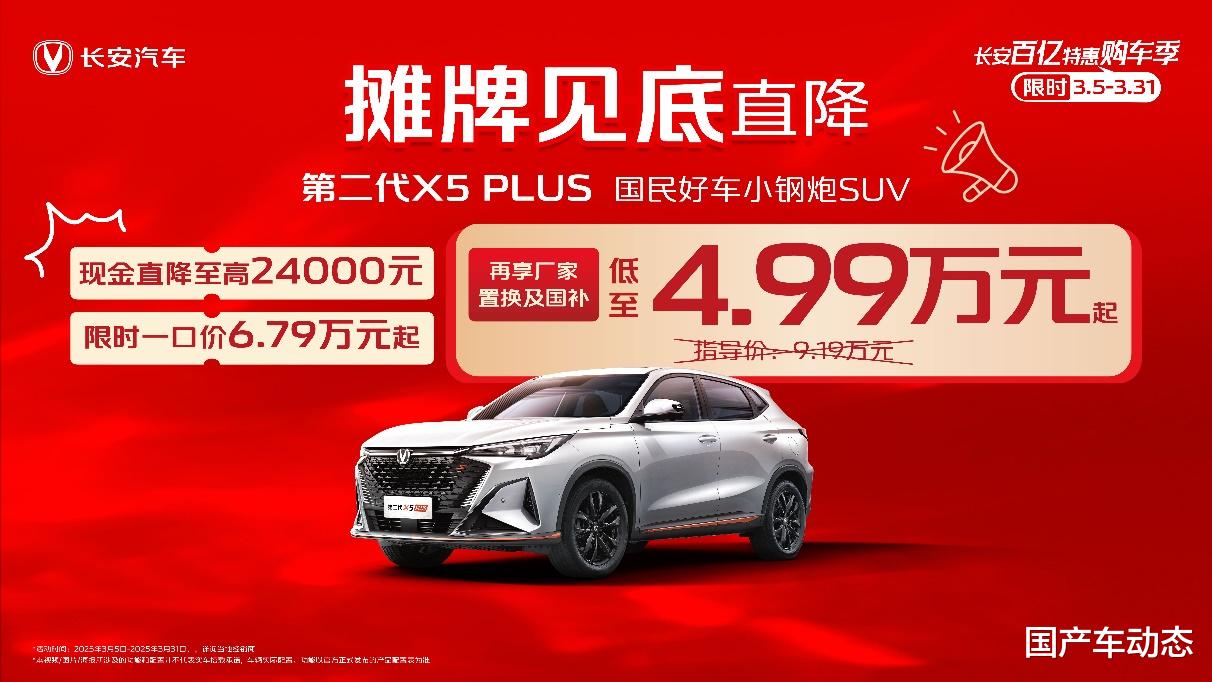 长安最近开启的“长安百亿购车特惠季”活动,算是把过去一年的“价格战”推向了一个高潮,别人家降价要么是国补加一些、要么是置换力度大一些,而长安却是直接摊牌见底价,不仅有厂家置换补贴与大额国补,更带来了现金直降,而且针对的都是旗下经典的畅销车。像这里看到的长安第二代X5PLUS,在本身定位9万级的情况下,就通过24000元现金直降叠加综合补贴,带来了低至4.99万元起的底价,新能源大厂见了都直呼跟不起。