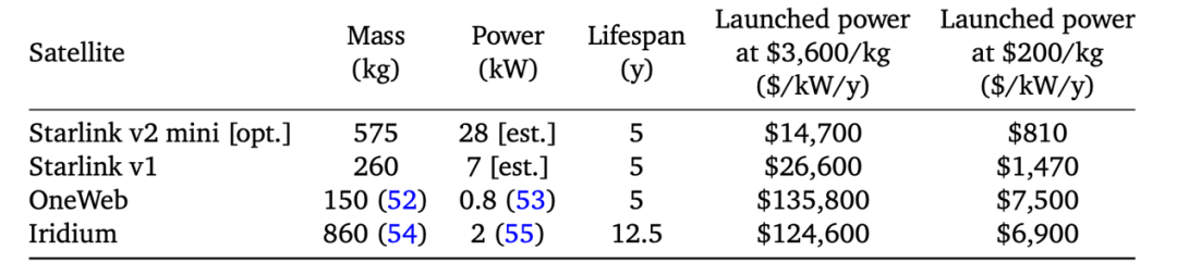 不同低地球轨道卫星的发射功率价格(来源:Google)