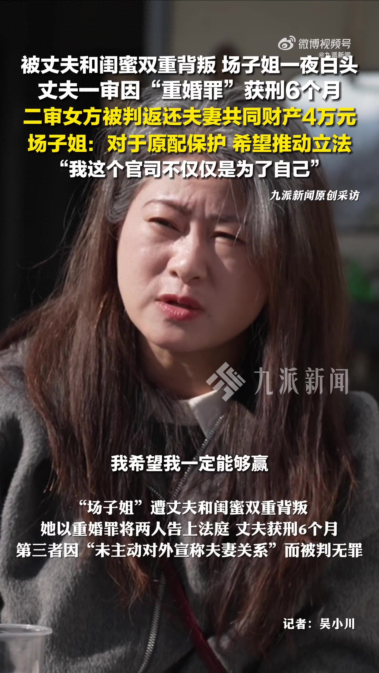 2月12日,“场子姐”在接受记者采访时表示,这场官司不仅仅是为了自己,“对于原配的保护,希望推动立法。哪怕让第三者给原配精神赔偿,破坏家庭的行为可能会少很多。”