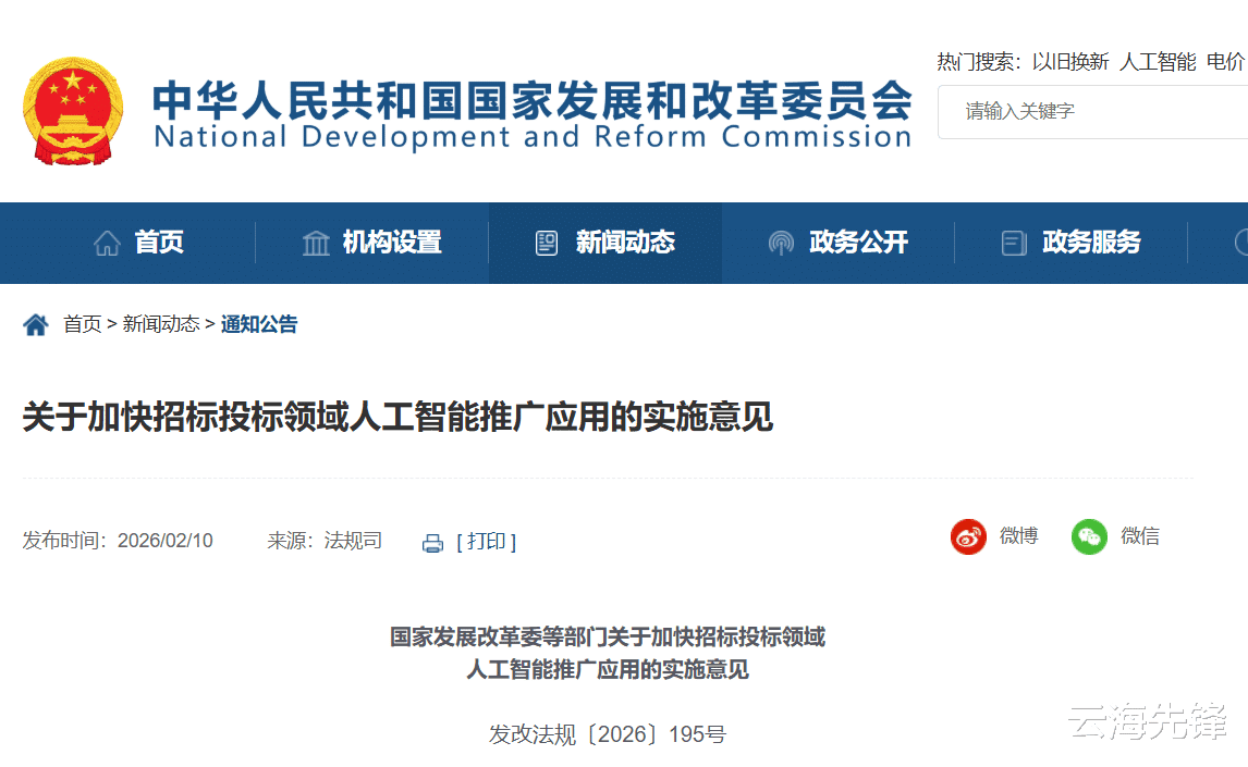 近日,国家发展改革委、工业和信息化部、住房城乡建设部、交通运输部、水利部、农业农村部、商务部、国务院国资委八部门联合印发《关于加快招标投标领域人工智能推广应用的实施意见》(以下简称《意见》),明确以“政府引导、场景牵引、安全可控”为原则,推动人工智能与招标投标全流程深度融合,计划到2026年底实现招标文件检测、智能辅助评标、围串标识别等重点场景在部分省市全覆盖,2027年底在全国推广应用,为公共资源公平高效配置注入“数智力”。