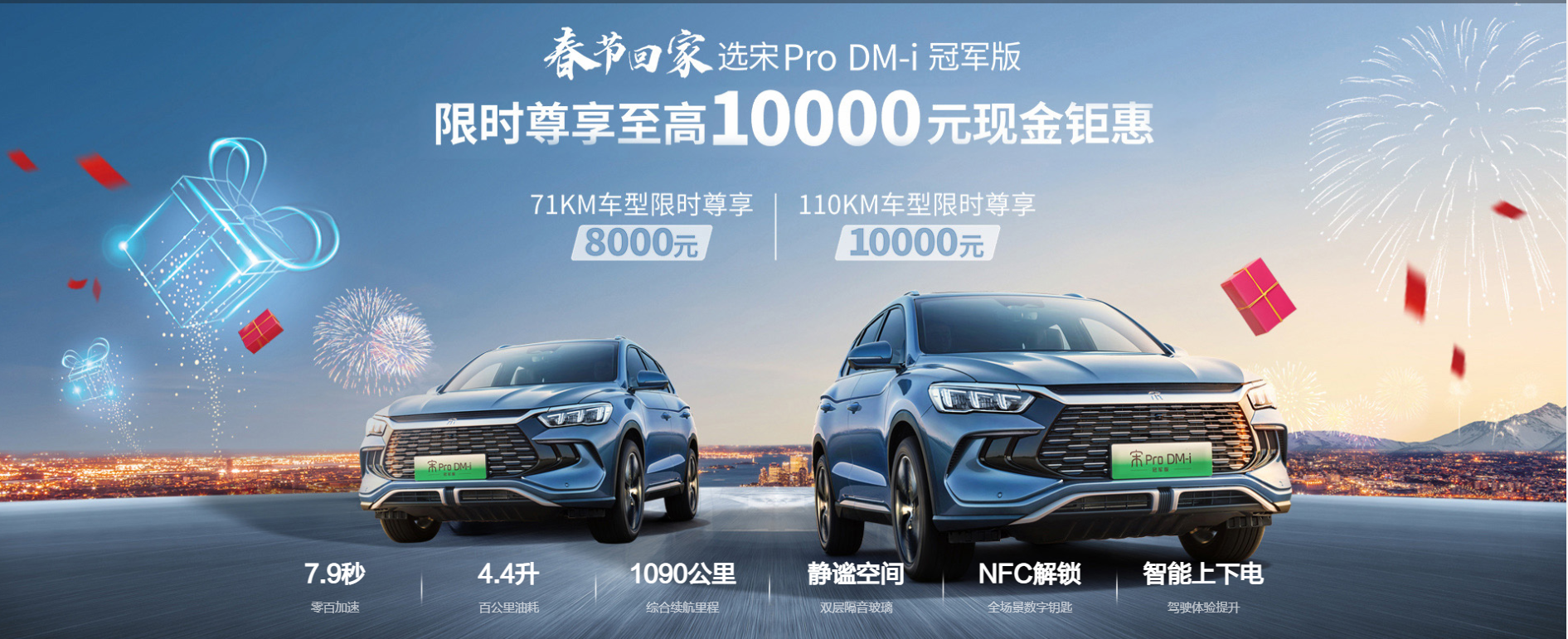 2023年9月26日,比亚迪宋Pro DM-i冠军版正式上市,我选择的宋PRO超越版110公里纯电续航可以满足我日常用电的需求,几天充一次电就可以了。考虑到官方补贴10000元,到手只需要12万多,为什么没买顶配?主要还是价格和性价比。宋pro dmi除了能享受官方10000元补贴,还能申请政府补贴,另外在配置方面也很不错,试驾体验也很棒。