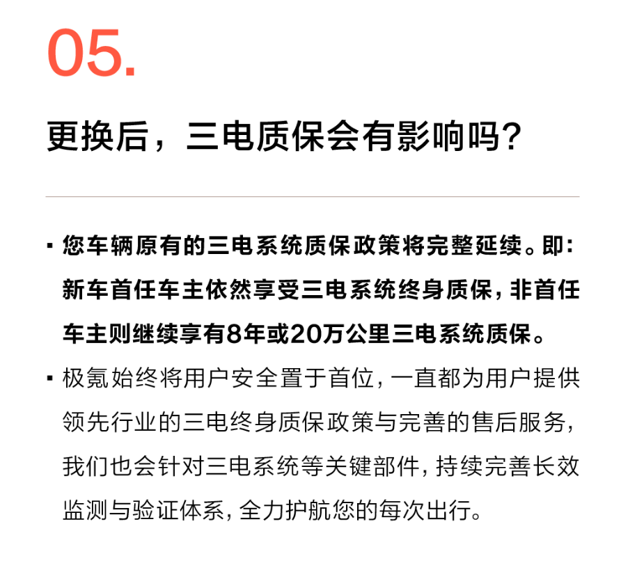 不仅消除了大家的用车安全隐患,后续首任车主的三电终身质保等权益也不会受任何影响,以后二手车残值也更高,何乐而不为?