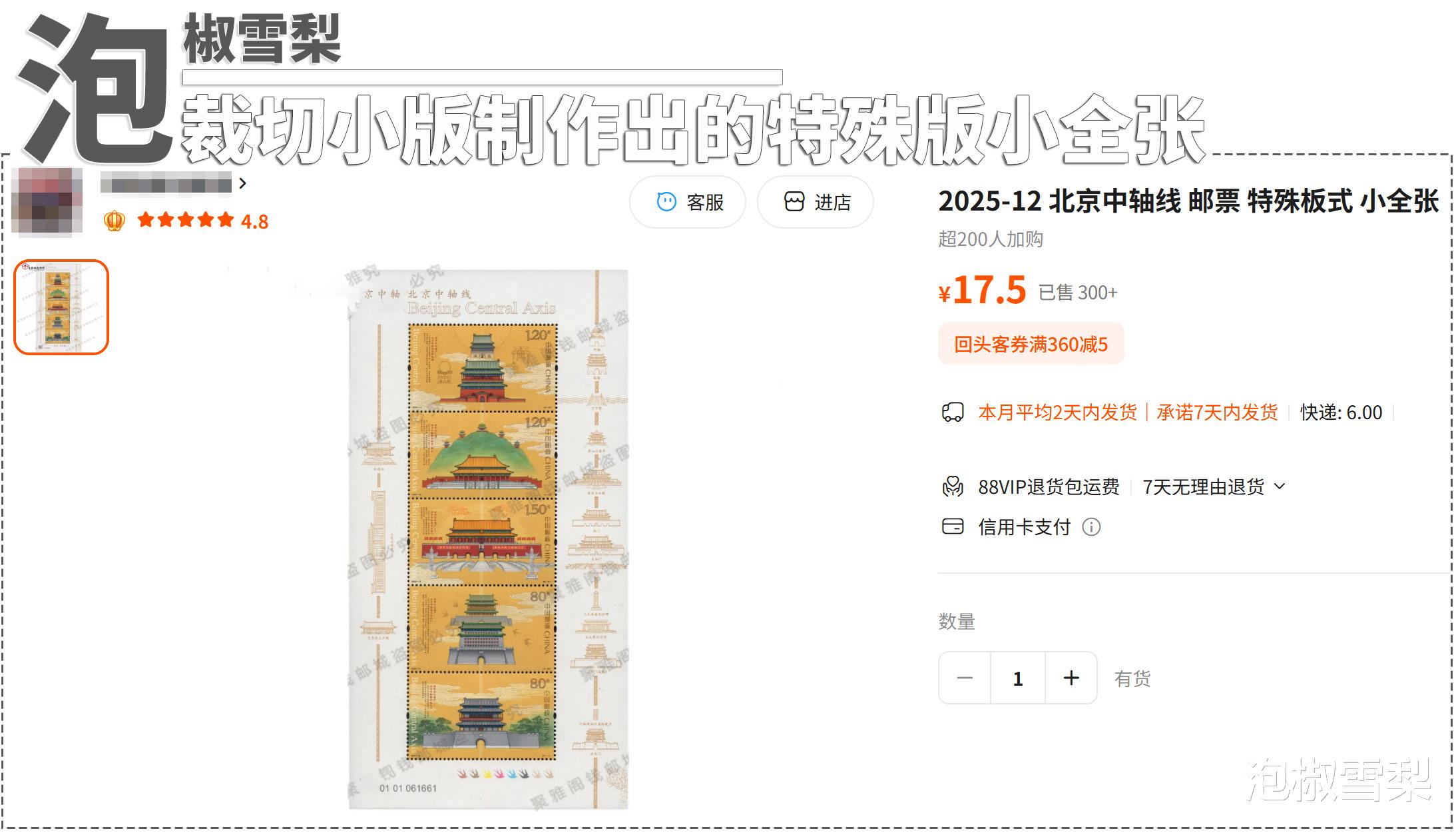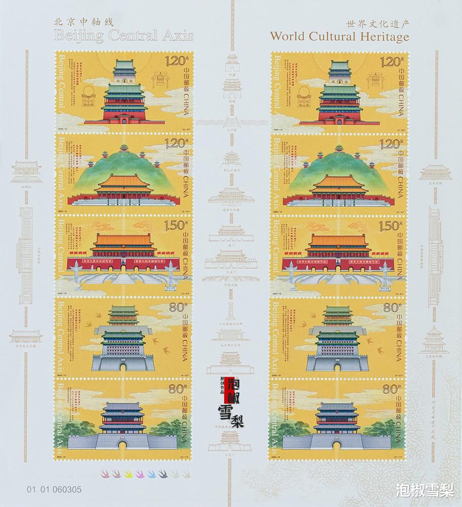 今年有的商家更是脑洞大开,在迟迟未发货的《北京中轴线》长卷版上打起了主意。由于长卷版一直没有发货,且网上也没有图稿流出,于是有人就将包含两套邮票的小版张裁开,把左侧较为完整的部分当作长卷的替代品出售,很多集邮者第一眼甚至都没发现其中的问题。