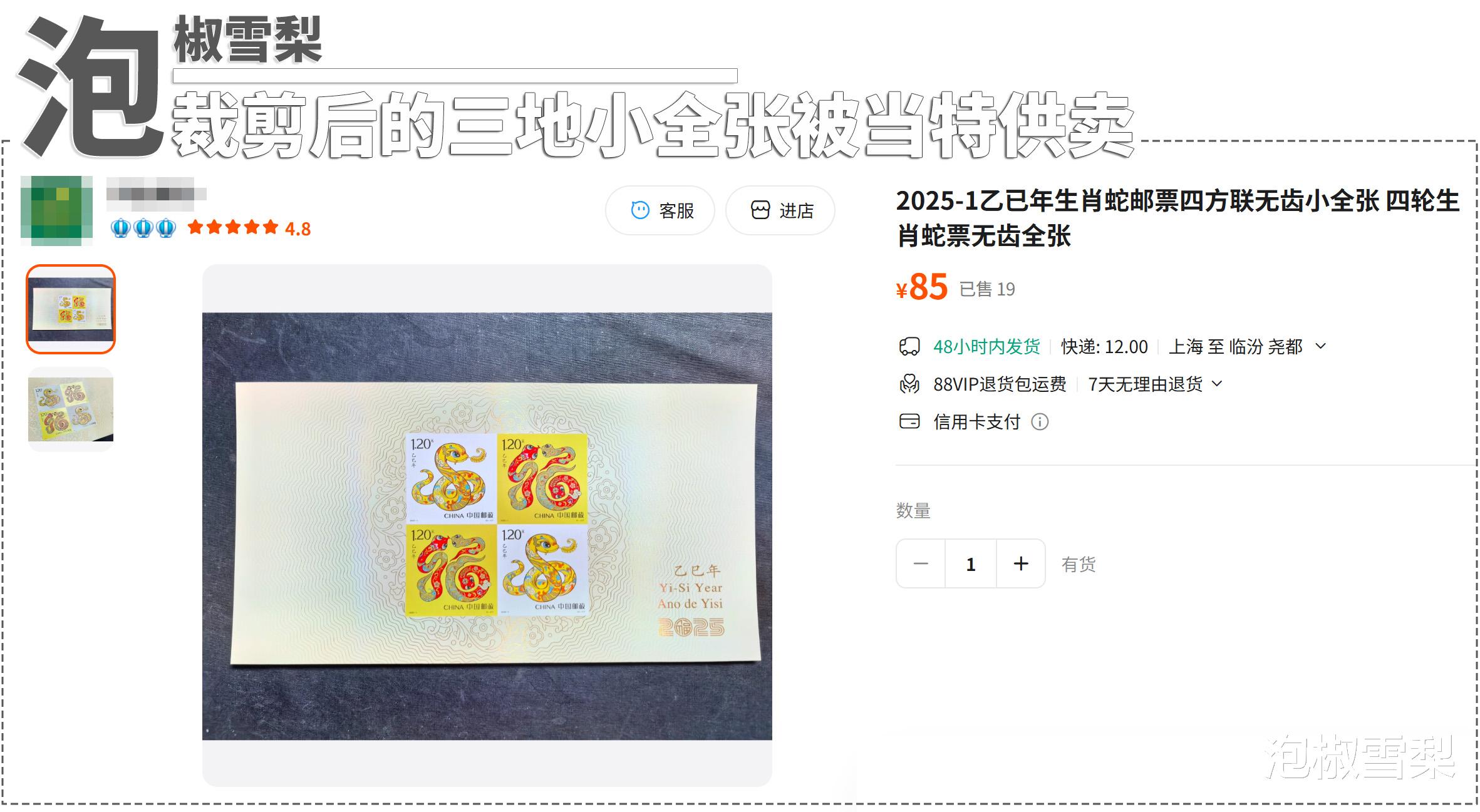 最近在某平台上看到,有邮商把2025年发行的蛇三地小全张裁开,将上半部分单独拿出来出售,说是特供的无齿小版张,售价还高达85元,比没裁开的小全张还要贵。