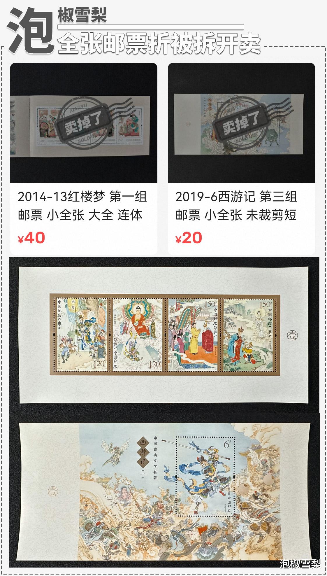 这种情况其实早在多年前就曾出现过,前几年由于网厅“618”活动,西游记全张邮票折突然放出了一批货,致使该邮票市场价快速跌到了百元以下,于是就有人将里面的内页拆出,当作小全张和特殊版小型张出售。