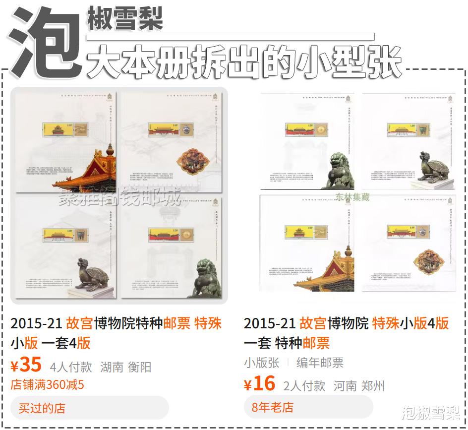 也许是受到全张邮票折的启发,之后又有一些商家将跌破发行价的大本册内页拆开出售,反正大本册的内页很少有人见过,拆出来直接变成市面上罕见的版式,名字更是信手拈来,包含一套邮票的就叫小全张,包含两套及以上邮票的就叫小版张,而且都是真邮票,拿到哪鉴定也算不上售假。