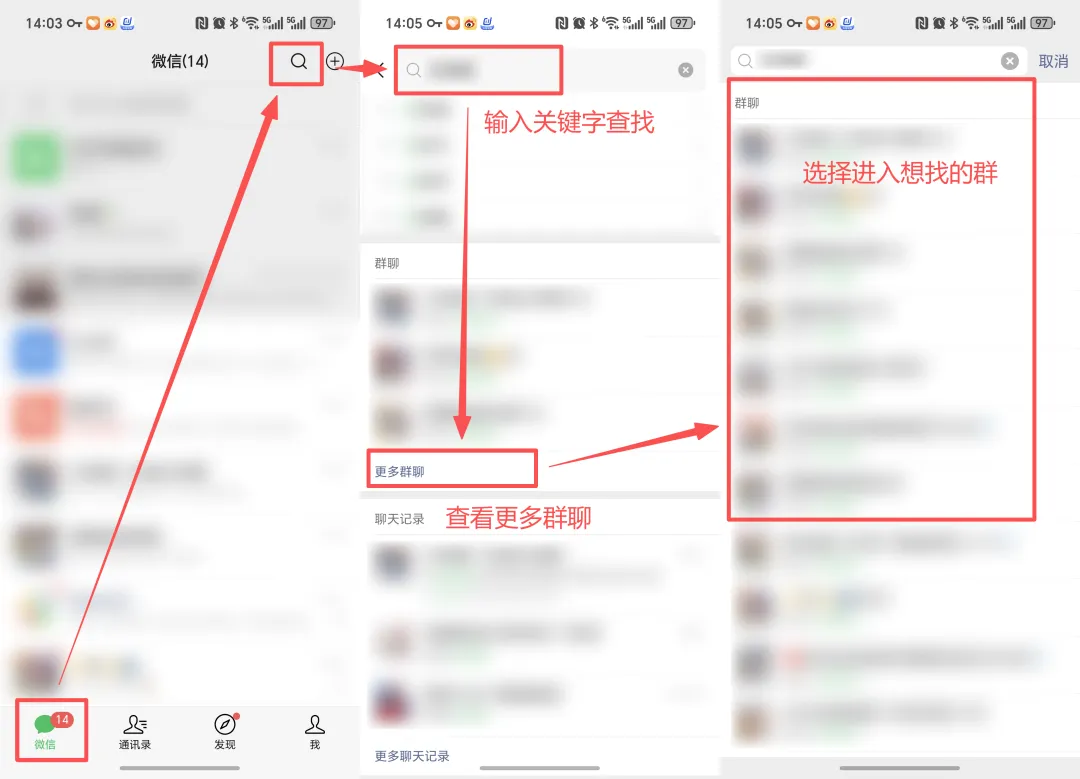 如果记得群聊的部分信息,诸如群名、聊天内容的关键词、群成员昵称等信息,使用搜索功能会更为便捷。