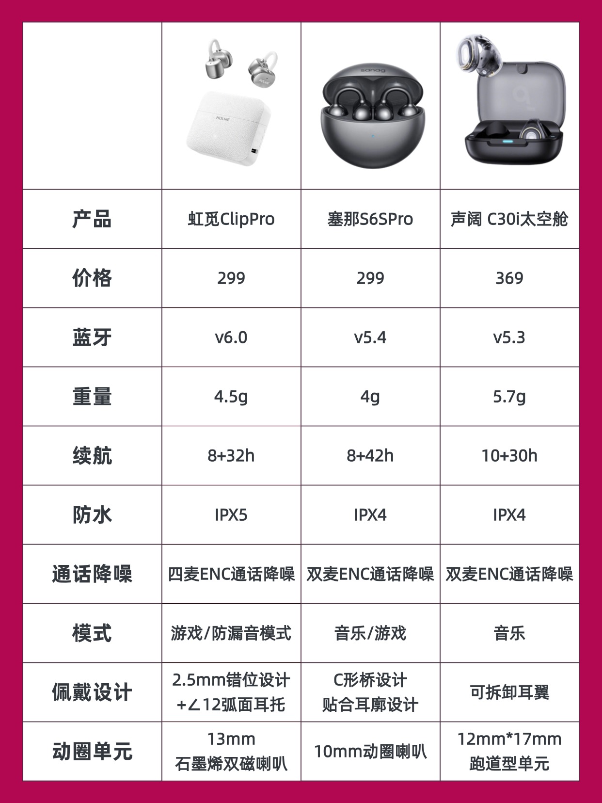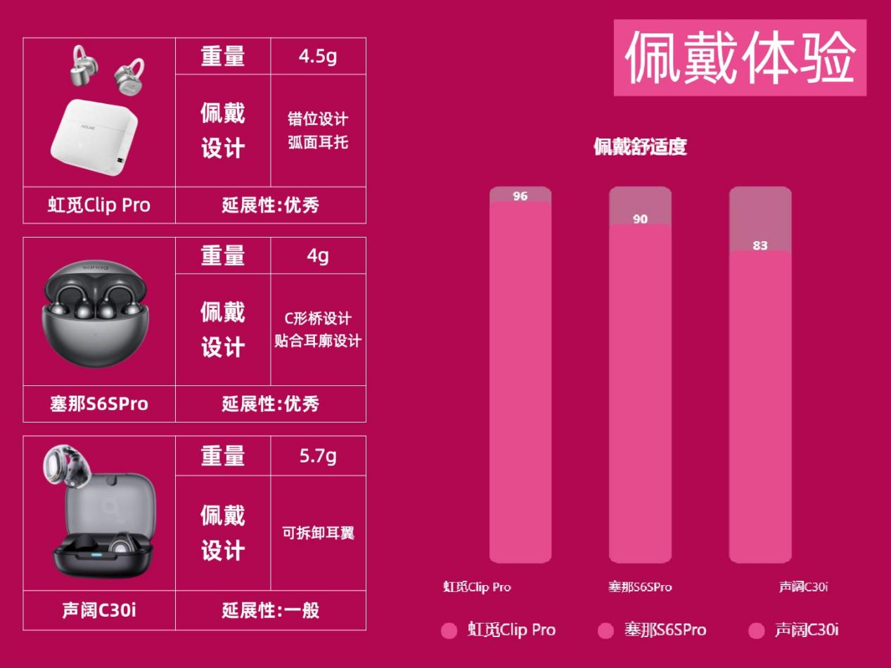 耳夹式耳机如今越来越受欢迎,使用人群不断增多,甚至有逐步替代入耳式的趋势。它不用塞耳道,佩戴舒适透气,久戴不闷胀。不过市面上产品质量差异大,很多人选购时拿不准。今天我带来虹觅Clip Pro、塞那S6SPro、声阔C30i三款热门机型实测,结合真实使用体验,帮你理清选购的方向。