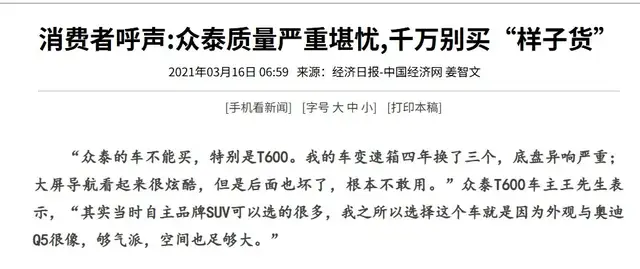 有的网友吐槽,“众泰的车不能买,特别是T600。我的车变速箱四年换了三个,底盘异响严重;大屏导航看起来很炫酷,但是后面也坏了,根本不敢用。”众泰T600自动尊贵版车主王先生表示,“我印象最深的一件事就是,曾经用一挡跑将近100公里去维修站,倒挡甚至已经不能用了。”二手车商纷纷拒收,最终只能低价卖给不懂行的买家。