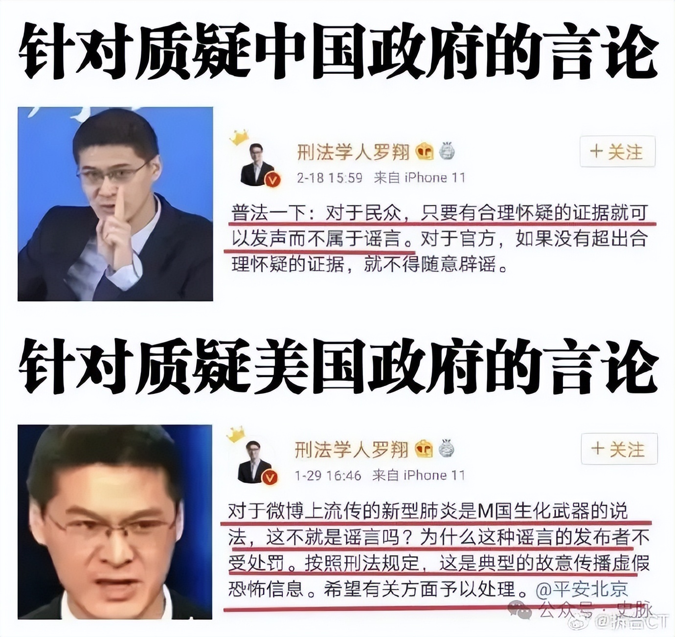 很凑巧还让他们找到了,他在疫情期间的双标的说法,针对病毒是从武汉实验室的言论,他说法律允许民众有合理的质疑;而对新冠肺炎是美国的生化武器时,他却说这是谣言,并且让有关部门予以处理,同样一件事罗教授处理方式完全不同。