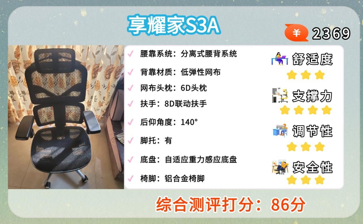 享耀家S3A在舒适性和支撑性上表现出色。座椅用低弹网布,透气且能均匀分散压力,避免久坐不适。椅背搭配动态自适应腰托,可实时感知腰部动作,自动调节支撑力度和角度,精准贴合腰椎曲线。腰托支持5档高度调节,靠背最大后仰140°,办公和午休都适用。