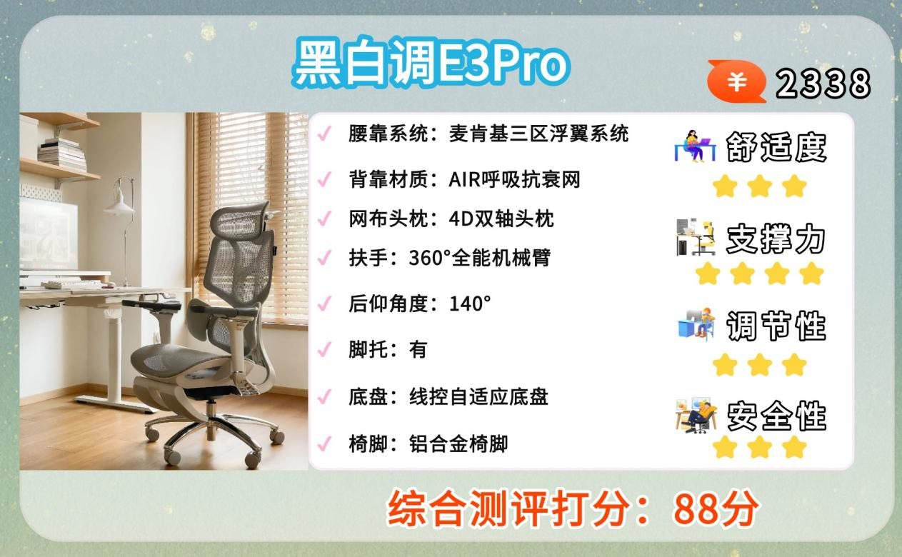 黑白调E3 Pro的舒适度和调节灵活性都很出色。它的3区云翼追腰系统能根据腰背曲线动态分区支撑,中间托住脊柱,两侧包裹腰肌,坐久了也不累。头枕是4维双轴设计,扶手支持360°旋转,可轻松找到最舒适角度。