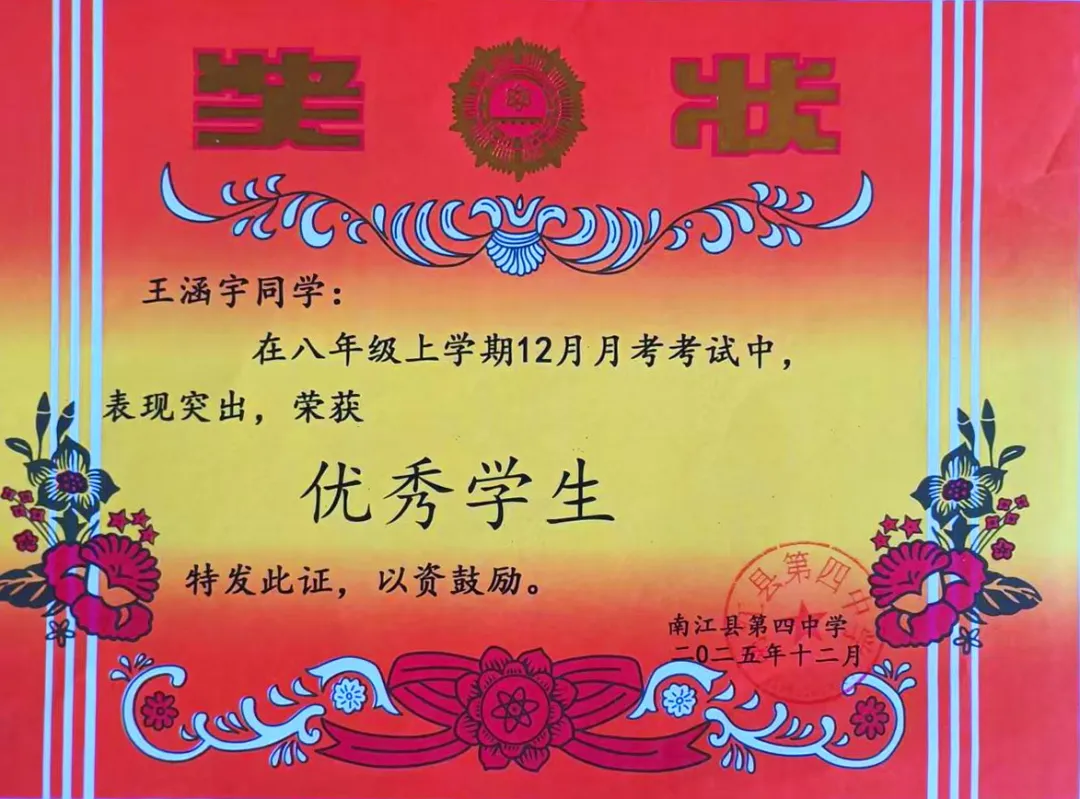 首站抵达沙河镇。受助少年涵宇的笑容,如冬日暖阳般感染了众人。在助学会的帮扶下,涵宇学习刻苦,成绩优异,先后荣获南江县第四中学2025年3月月考“学习之星”、八年级上学期12月月考“优秀学生”等称号。他腼腆地向志愿者展示奖状,分享进步喜悦:“今年评上了优秀学生,家里生活也越来越好!”言语间充满对未来的憧憬。志愿者的长期帮扶,如同一颗善意的种子,已在这位少年心中生根发芽,茁壮成长。