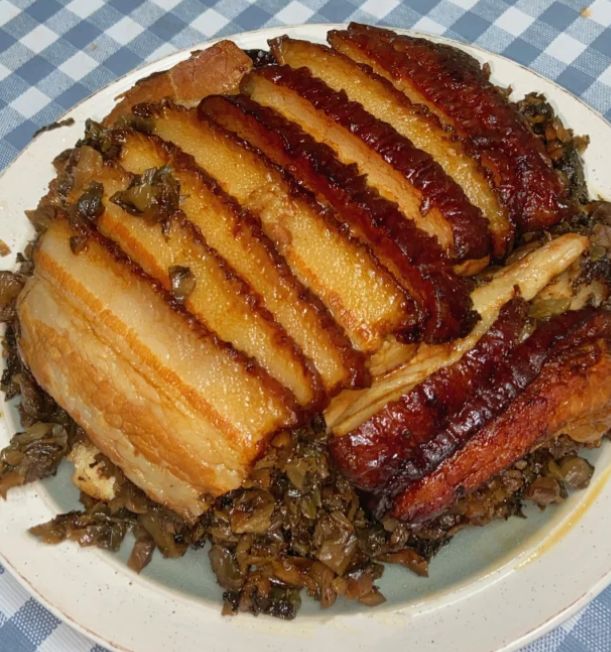 蒸好后,取大盘扣于碗上,迅速翻转,将扣肉倒扣入盘,撒上葱花点缀。此时,肉色枣红透亮,梅干菜裹着肉香,汤汁黏稠鲜美,入口即化,肥而不腻。湖南梅干菜扣肉不仅承载着家的味道,更蕴含着对传统技艺的传承与创新,无论是日常家宴还是节日聚餐,都是一道令人回味无穷的佳肴。