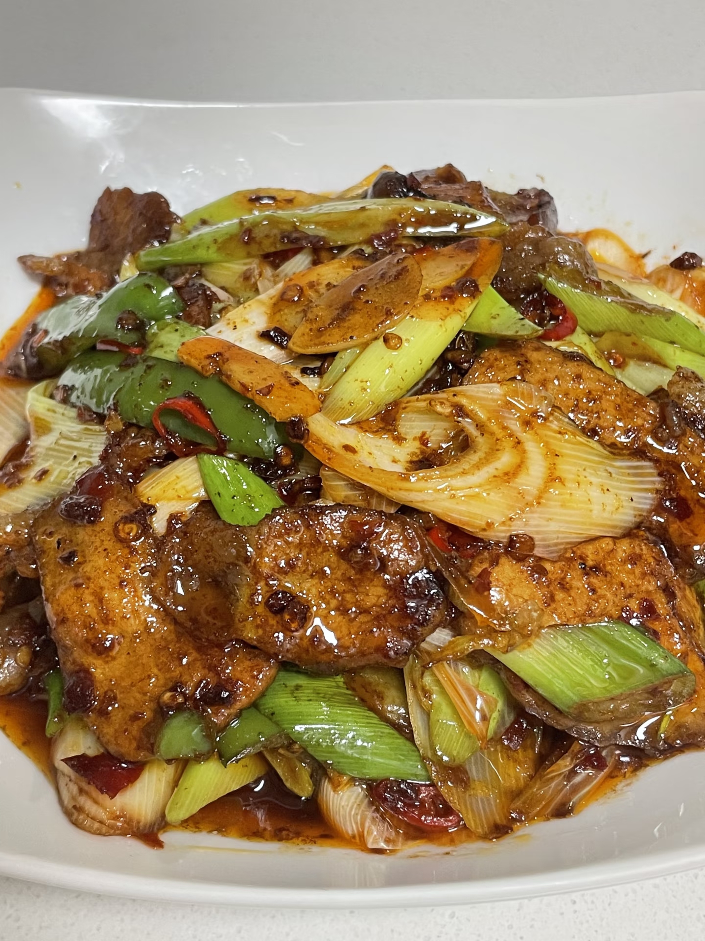 盛盘的时候看着焦糖色的五花肉片裹着红亮的酱汁,翠绿的青椒和雪白的葱段点缀其间,光是看着就让人食指大动。先夹一块五花肉尝尝,外皮焦香内里软嫩,油脂的香味在嘴里爆开却一点都不腻;再吃口大葱,脆甜中带着肉香,酱汁的咸甜恰到好处;青椒更是吸饱了所有精华,咬下去咯吱咯吱响。最绝的是拿汤汁拌米饭,每一粒米饭都裹上浓郁的酱汁,配上几片五花肉和葱段,简直是人间至味!