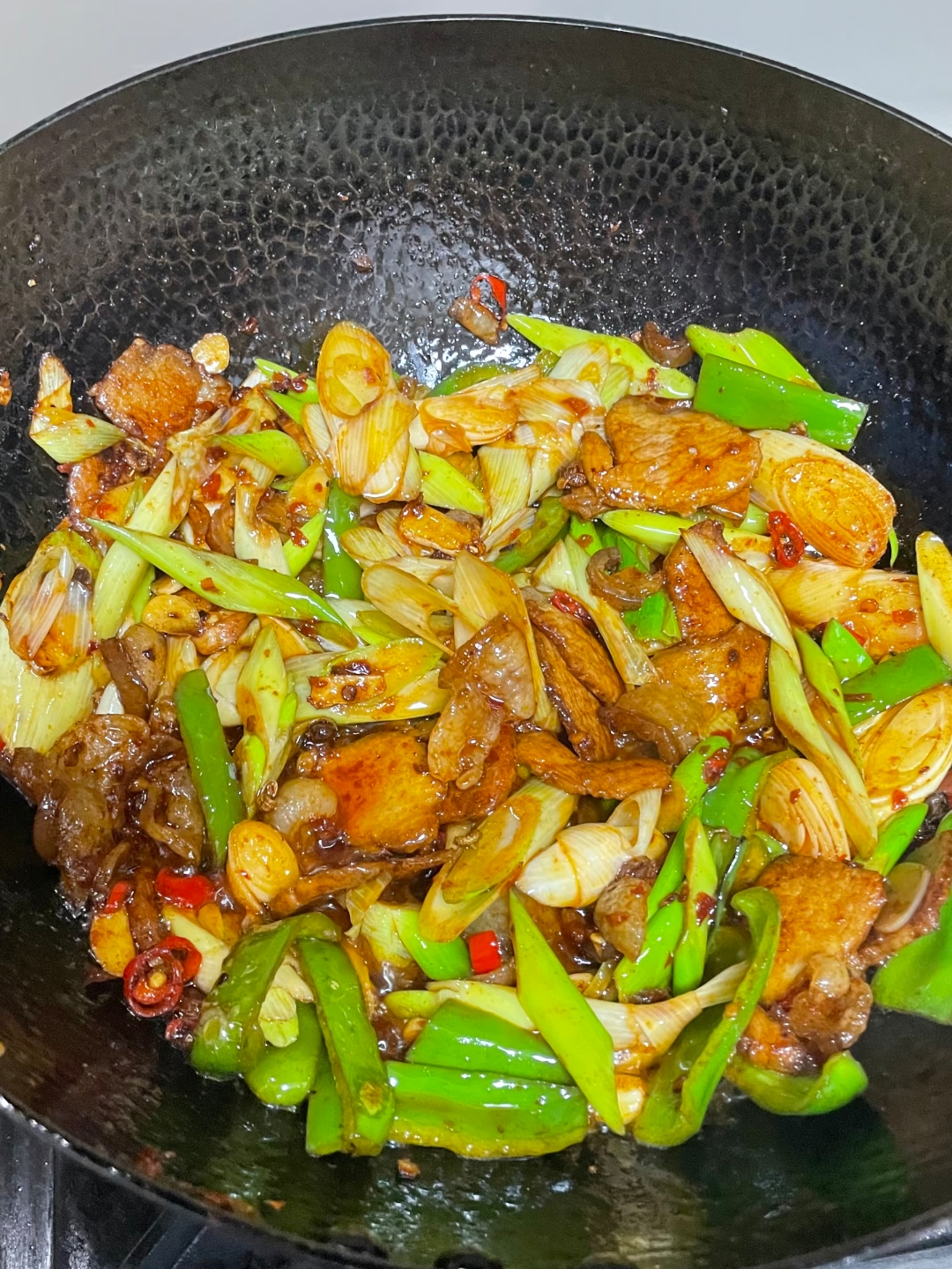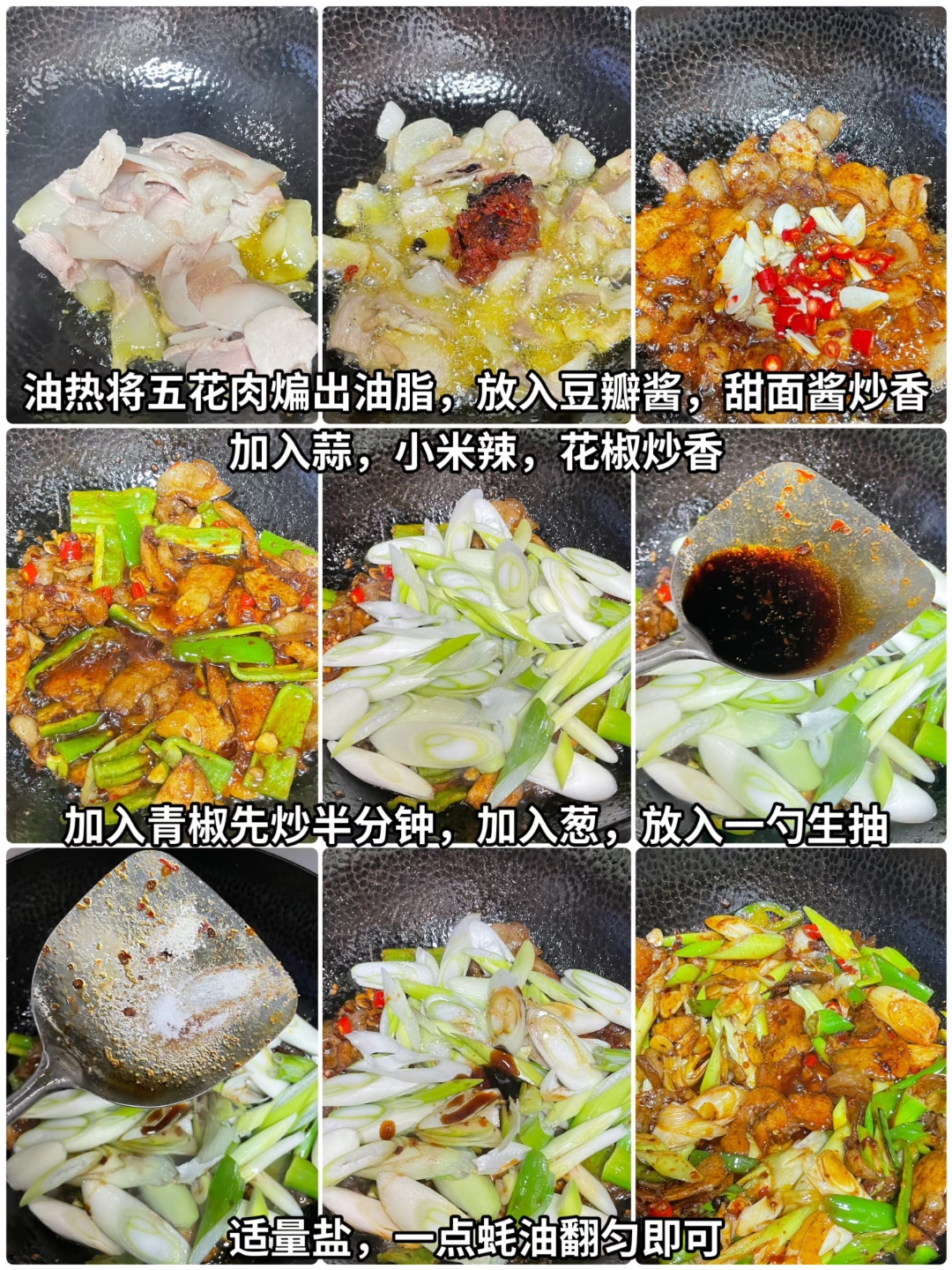 然后先放青椒块翻炒半分钟,让青椒吸收肉香同时保持脆嫩口感。重头戏来了——倒入葱段!这时候要开大火快速翻炒,让葱段在高温下释放出独特的辛香,大概20秒就够了,千万别炒太久,葱段变软就不好吃了。最后沿着锅边淋一勺生抽,加一点点盐和蚝油,翻炒均匀就能出锅啦!记得尝一下咸淡再调味,因为豆瓣酱和甜面酱本身就有咸味。
