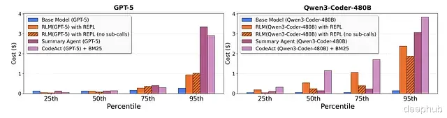效率和成本分析递归推理听起来开销应该很大,但实际数据却不是这样:RLM 的平均 API 成本跟基础模型差不多,有时候反而更低。