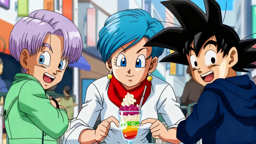 欢乐的日常,布尔玛、特兰克斯和孙悟天正在享用美食。