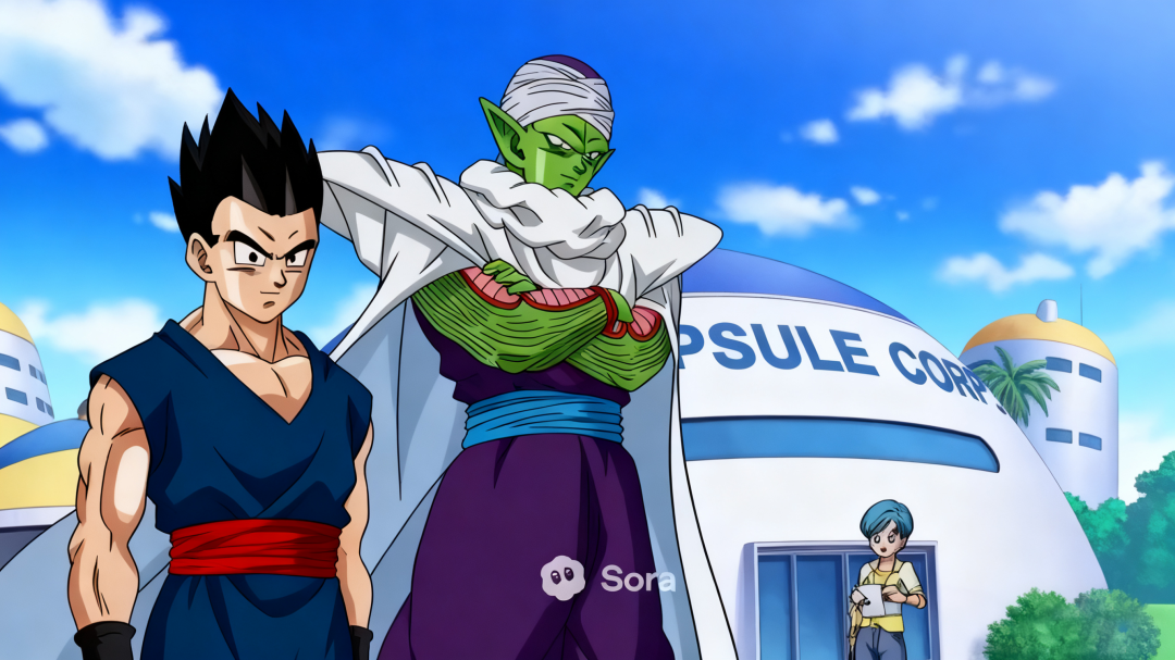 比克和悟饭师徒并排站立,身后是布尔玛和万能胶囊公司。