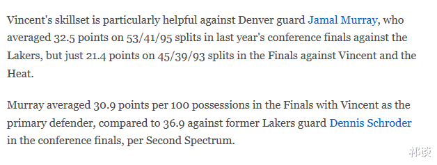 在总决赛中,当文森特作为主要防守人时,穆雷平均每百回合得到30.9分,相比之下,在面对施罗德的西部决赛中,穆雷平均每百回合得到36.9分。即将到来的首轮较量,哈姆如何使用文森特才是决定球队胜负的关键因素。