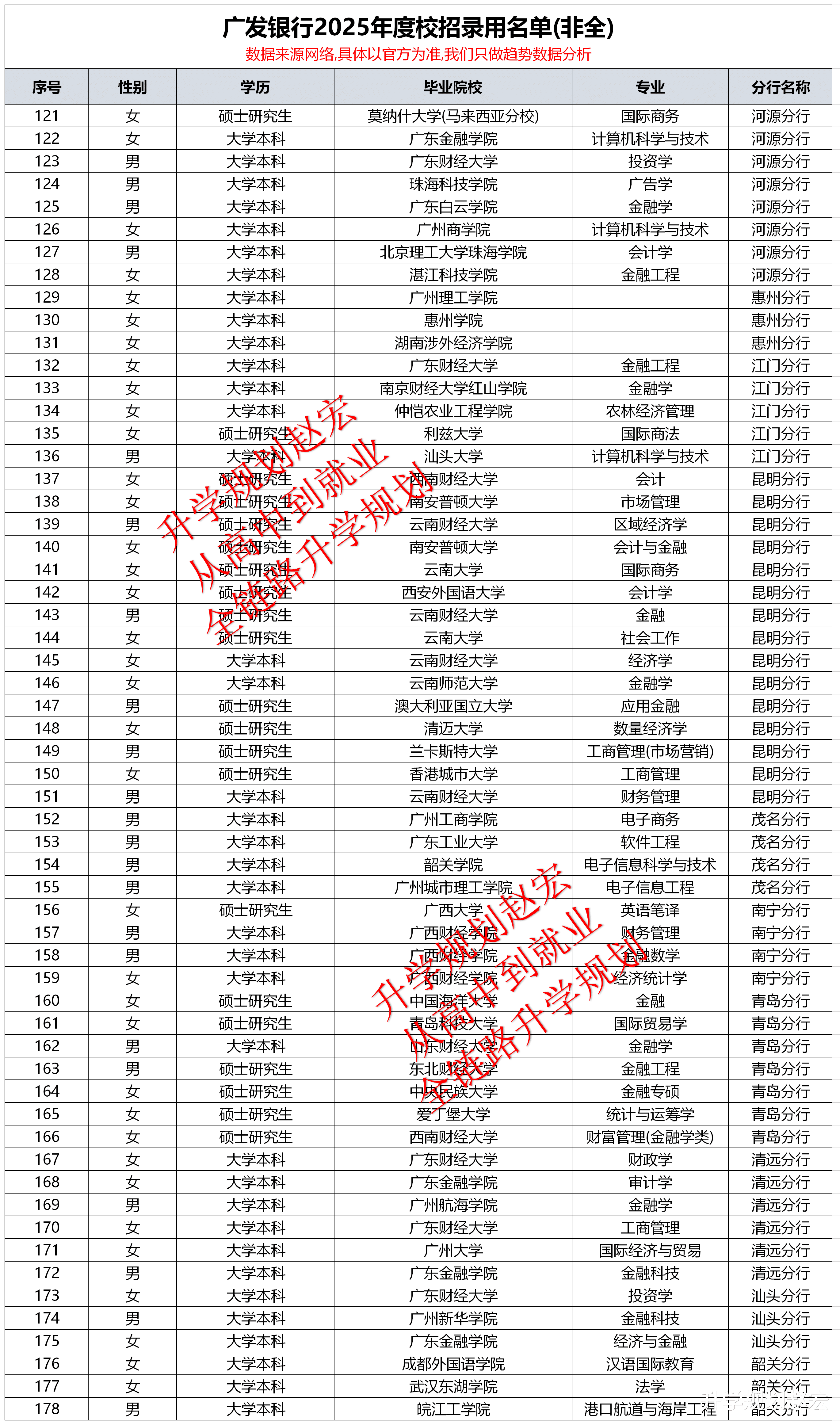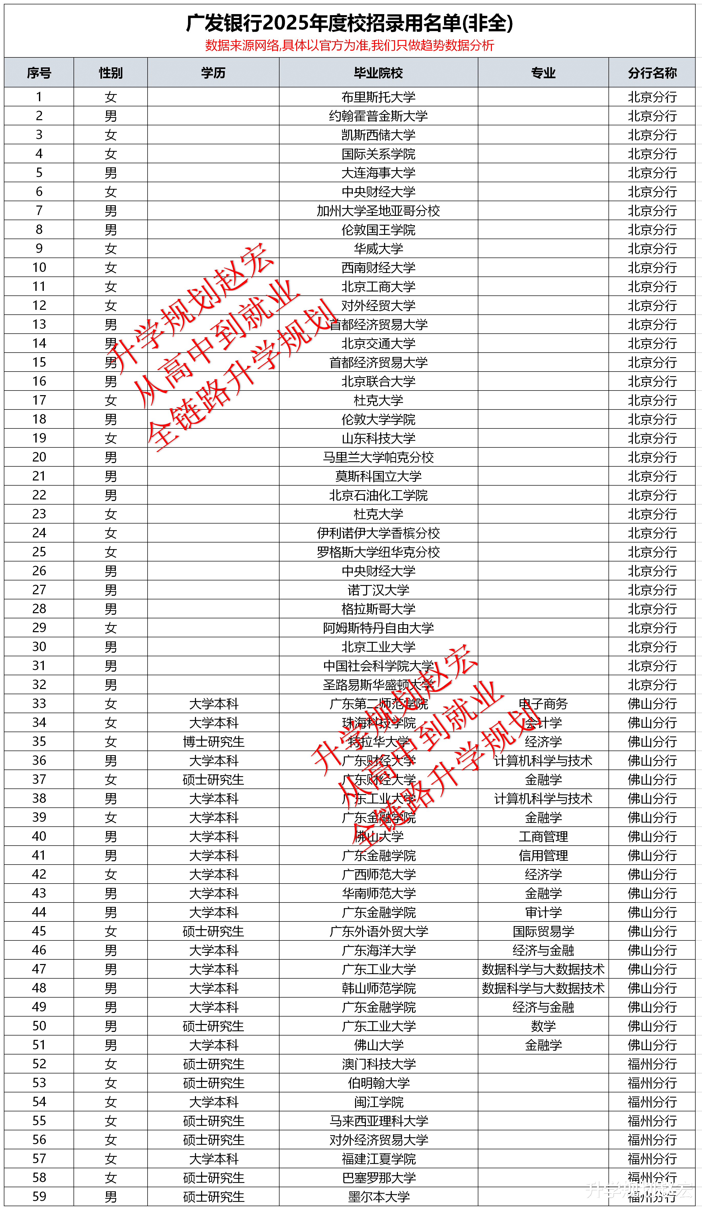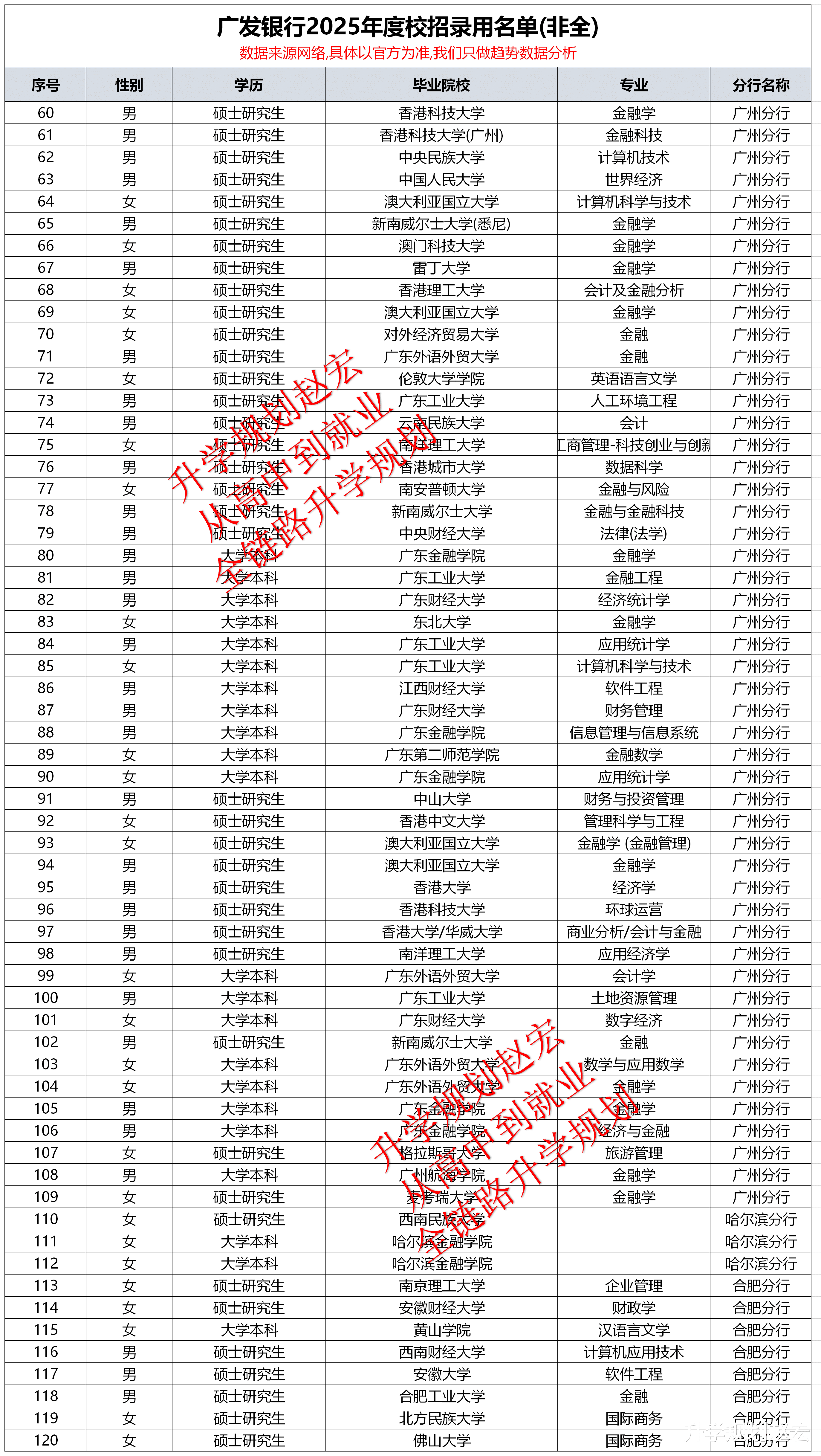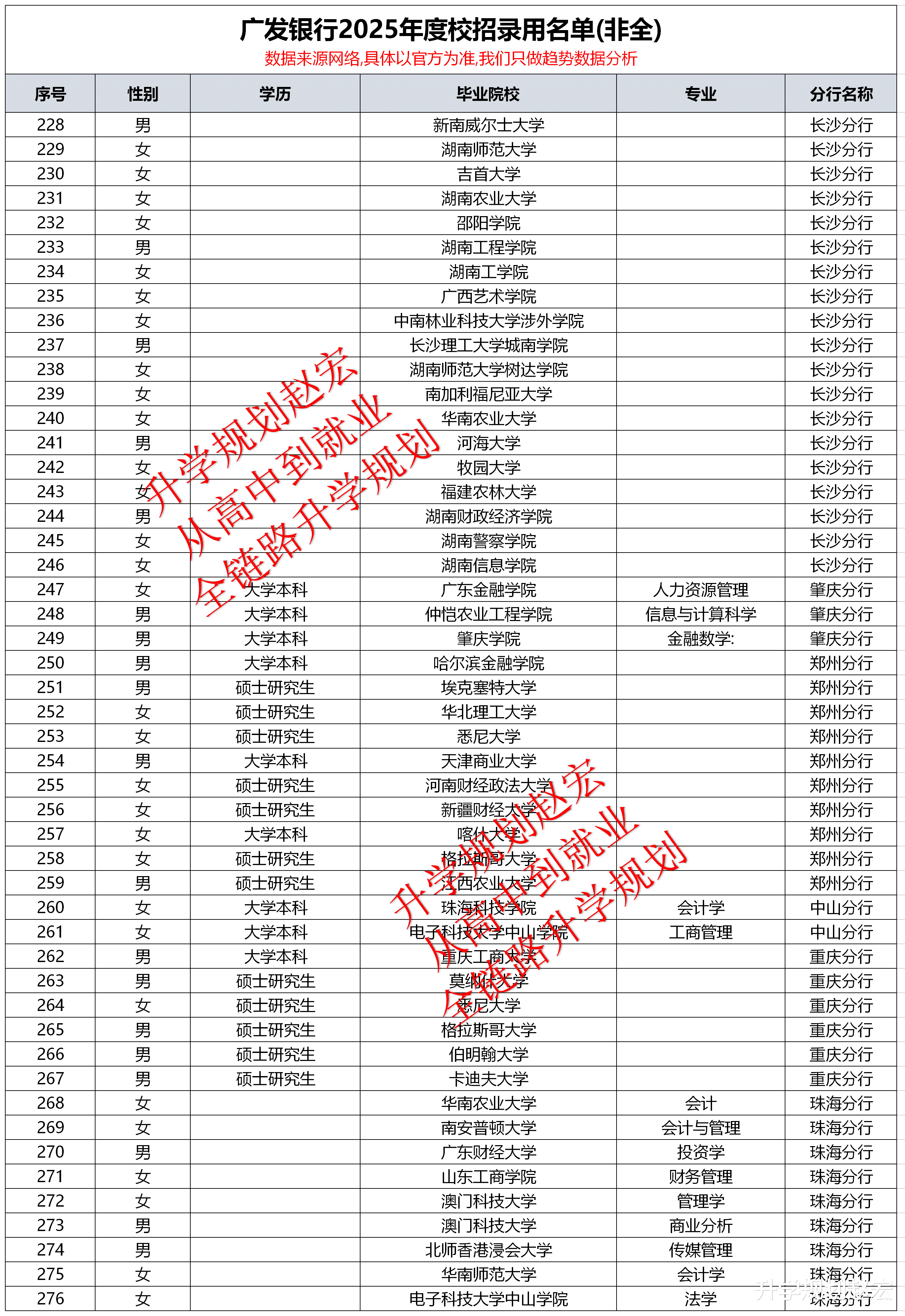 广发银行校招录用名单不会统一公布,都是各个分行自行公开,并且公示也非常零散。本文数据总共276人,30家分行,虽然数据不是全部,但是咱们想要的结果已经有了,重点不是名单,而是和其他银行做对比。然后拿到想要的结果,这个才是重点。人数最多的是广东金融学院,如果你看就业数据比较多,有没有发现这所大学会经常看到。然后就是本地院校比较多,留学院校也不少。学历上来说,也差不多是研究生和本科一半一半。