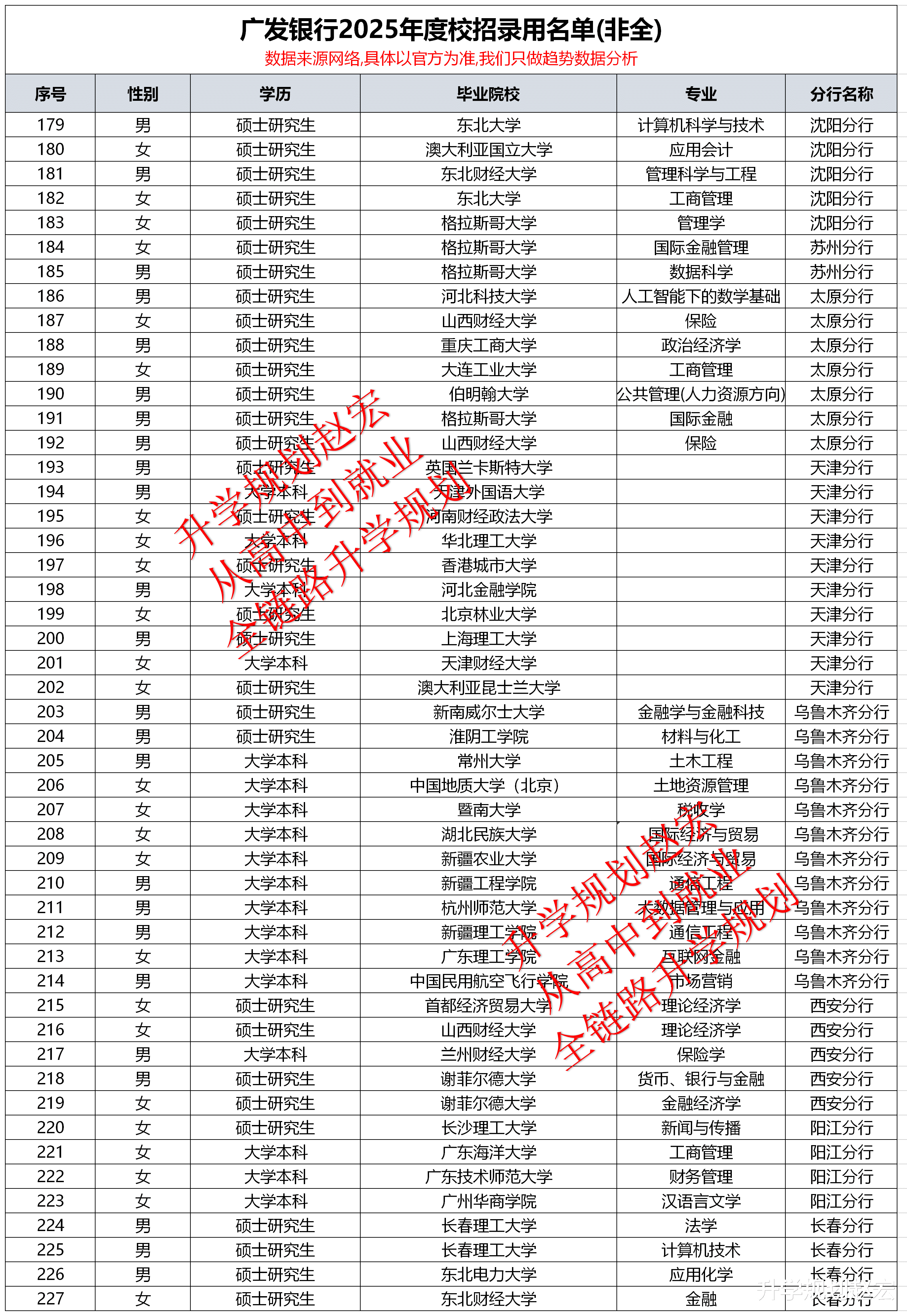 然后就是专业,从广发银行的部分分行公布的来看,其实是多样化的,除了经济金融来、财会类、法学类、计算机类外。还有公共管理、材料、社会工作、旅游管理、土木工程、市场营销等等。虽然人数少一些,其实未来的趋势就是多学科交叉的,不是单一的经济金融。同样土木专业,前面成都银行2026年校招名单,就有2名清华大学的土木同学上岸。