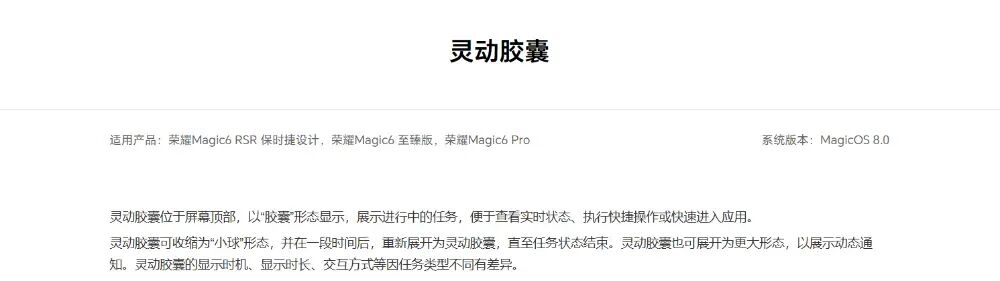 据了解,灵动胶囊是荣耀在MagicOS 8.0 上推出的类似“灵动岛”的功能,由 Magic 6 系列首发。