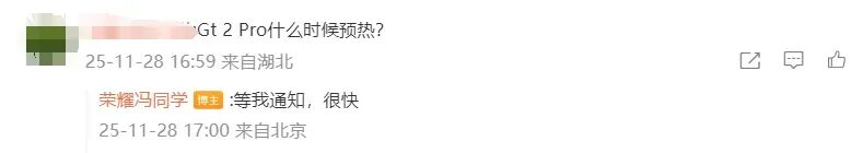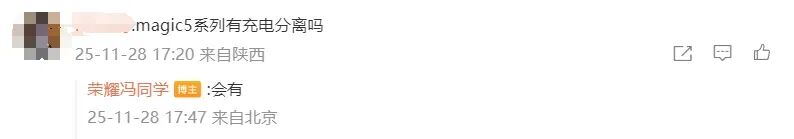 针对 Magic5 系列是否会支持充电分离,他表示:“会有。”针对荣耀 GT2 Pro 什么时候预热,他回复:“等我通知,很快。”