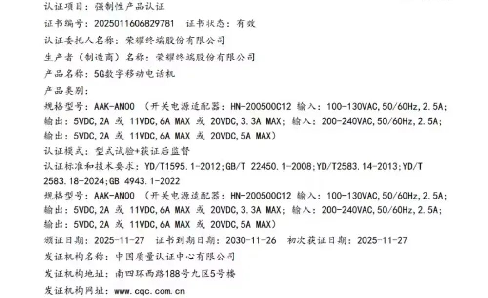 日前,有两款型号为 AAK-AN00、AAP-AN00 的荣耀新机通过 3C 质量认证,预计为荣耀 GT2 系列。