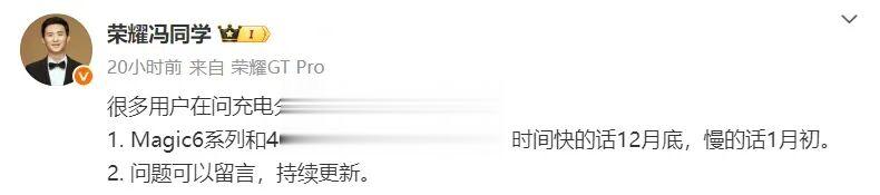 与此同时,荣耀游戏研发工程师@荣耀冯同学 发文透露,荣耀 Magic6 / 400 系列手机的「充电分离」功能预计 12 月底或 1 月初推送升级。