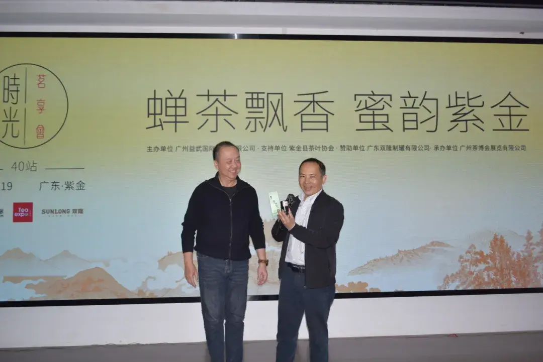 广东省茶业行业协会专职副会长张黎明在现场介绍带来的茶品的时候,提到她在办公室珍藏的一款10多年前曾获得省名优茶质量竞赛金奖的紫金蝉茶,没想到这款茶的制作人恰好坐在台下,他便是紫金县茶叶协会特别顾问陈炯昌老先生。张黎明提到,10多年前的紫金蝉茶名曰“五色茶”,市场不闻其名。然而在广东省名优茶质量竞赛中得到专家评委的一致好评荣获金奖。今天我们在"中国蝉茶之乡”品茶交流,喜遇故友重逢,共同见证紫金蝉茶产业发展。活跃了茶会的气氛。