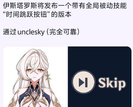 除此之外呢还有玩家爆料伊斯塔露后续进入卡池之后将带有一个全局存在的被动技能,也就是能够让剧情快速跳过的时间跳跃按钮效果,我只能说这个爆料的真实性有点太低了,因为这种天赋效果直接改变游戏性质过于离谱了,抽角色就能跳过剧情的话那个原神真要被钉在游戏历史的耻辱柱上了。