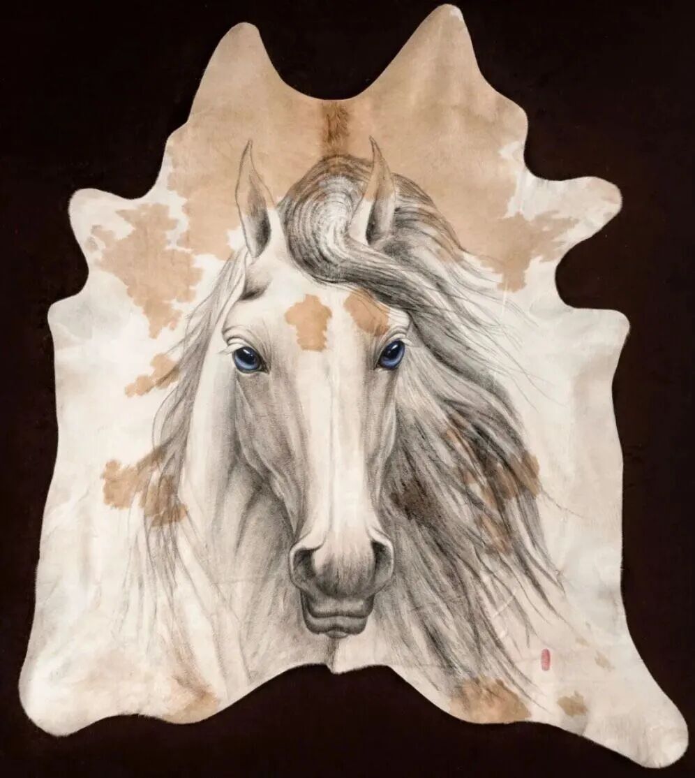 那匹马很不听话,怎么也不肯往前走,她就不停抚摸马背和脖子,在跟马“聊天”的过程中,突然感受到毛皮这种材料质地的特殊。她想到用艺术的附加值去体现生命的延续,在毛皮上作画,让图像“活过来”,回归生命的本质。