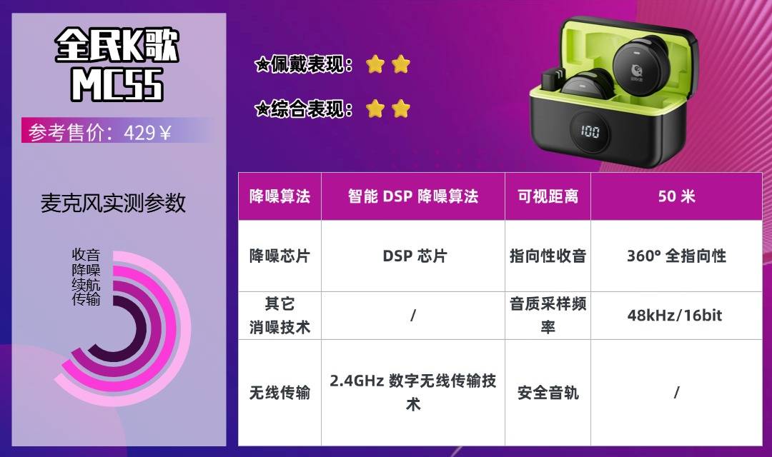 全民K歌MC55是一款娱乐创作专属无线麦克风,与全民K歌APP深度联动,混响效果可一键调节,唱歌质感明显提升。高保真拾音单元的人声还原度能满足录歌需求,录制的歌曲清晰通透;突出降噪对环境杂音过滤效果好,小声哼唱也能清晰收录。2.4G传输距离远,开阔环境下信号稳定无延迟;内置风噪抑制功能,户外轻微刮风无需防风罩也能正常收音,但不支持专业级采样规格,后期修音空间有限。设备操作设计贴合娱乐需求,一键切换K歌/录音模式,机身小巧精致,适合喜欢唱歌、录制K歌短视频的用户。