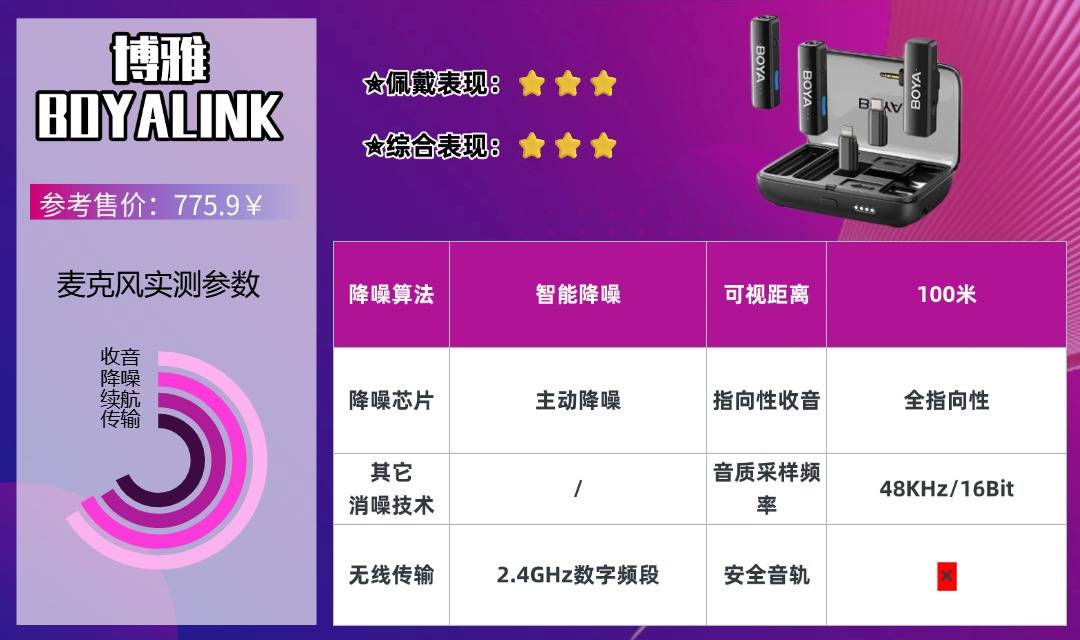 博雅BOYALINK是一款轻量化入门级无线麦克风,专为口播、访谈等室内场景设计。4mm咪头收音精准度高,能清晰还原人声细节;2.4G传输距离可达100米,音画同步延迟低,满足短视频、直播基础需求。AI降噪对空调声、键盘声等室内杂音过滤效果显著,但复杂户外环境需搭配防风罩使用,且对六级以上大风的风噪压制效果有限。设备操作简单,机身仅设电源键和降噪键,苹果、安卓手机可直接插用,无需转接头;哑光机身不沾指纹,黑白双色可选,适配不同拍摄场景。总续航30小时,续航能力充足,性价比突出,非常适合新手入门选择。