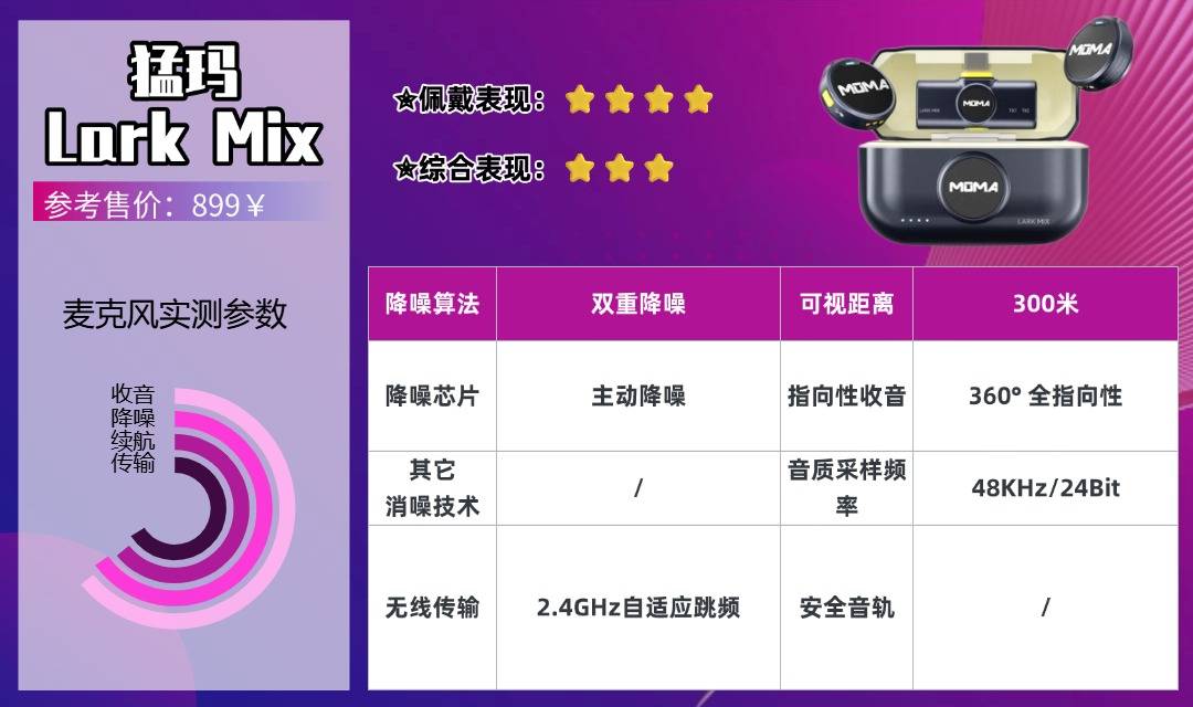 猛玛Lark Mix是一款长续航多人协作无线麦克风,全指向拾音单元覆盖范围广,多人拍摄时各方位人声清晰无偏差,音质达到基础专业水准。300米传输距离远超同价位产品,户外远距离移动拍摄时信号稳定不卡顿;双重降噪2.0对日常杂音过滤效果好,轻微刮风几乎没有影响,但不支持实时监听,无法当场调整收音效果。30小时超长续航足够全天户外拍摄,无需频繁找充电地点;开机自动配对,双发射器可独立工作互不干扰。机身设计简约轻便,夹戴隐蔽性强,适合注重续航和多人协作的基础专业创作者。