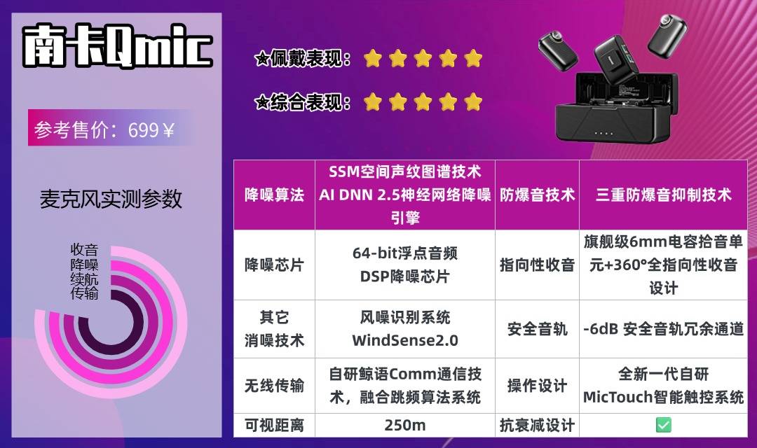 硬件配置上,南卡 Qmic 更是直接拉满千元旗舰水准:48kHz 采样率 + 24Bit 位深,从底子上保证了录音棚级别的音质;支持重度、轻度两档降噪和 20 档增益调节,再加上三重防爆音系统,不管你声音大小都能稳稳拿捏。