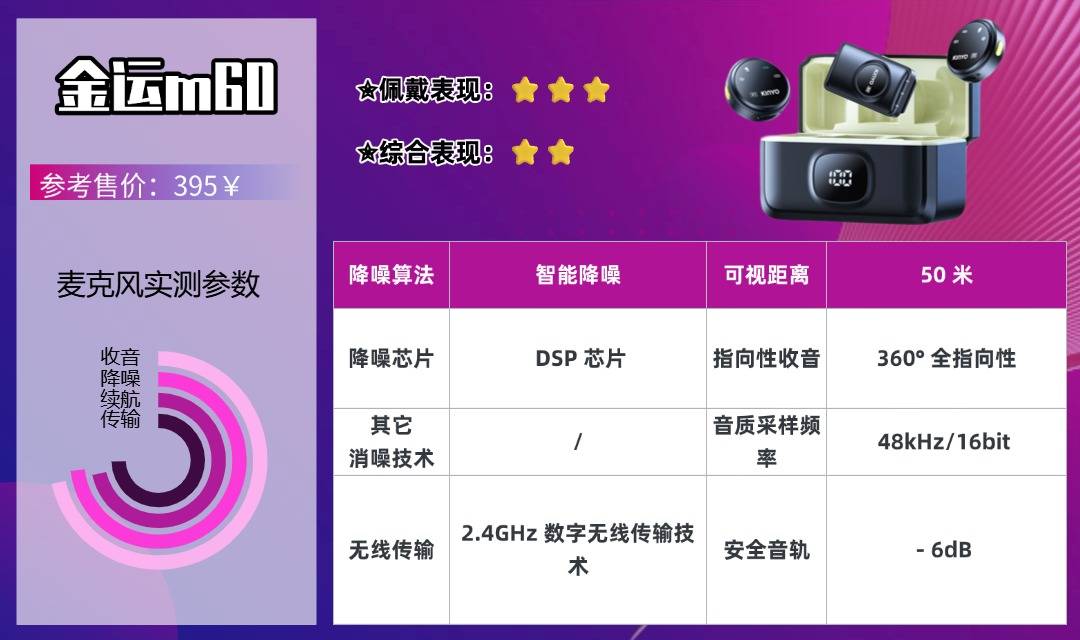 金运m60是一款长续航多场景入门无线麦克风,立体声录音技术让音频层次感更强,沉浸感远超多数单声道产品;人声还原度能满足短视频平台发布标准。短距离信号传输稳定,口型同步精准无延迟;基础降噪对室内杂音过滤效果好,户外复杂环境下效果一般,需搭配防风罩,且不支持一拖多模式,多人拍摄需额外购买设备。30小时续航支持全天户外直播、探店,续航表现优于多数同价位产品;操作设计极简,仅一个电源键,开机即可工作。机身重量适中,夹扣防滑,日常拍摄不会轻易掉落,适合追求长续航的入门创作者。
