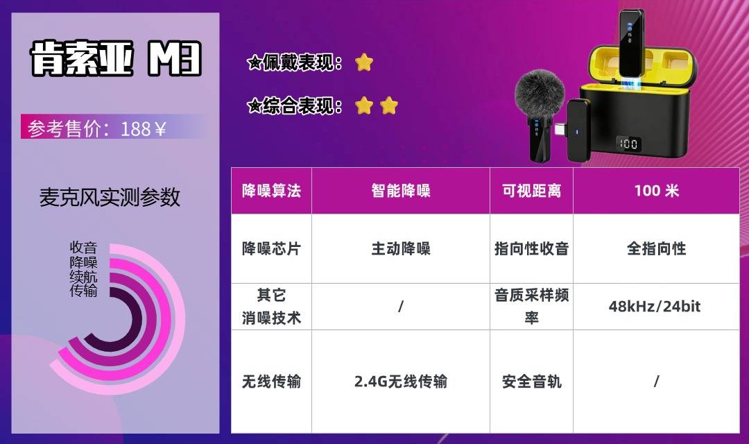 肯索亚 M3 是一款高性价比全能入门无线麦克风,凭借 AI 双重降噪技术成为自媒体人的热门选择。其降噪能力表现突出,能有效屏蔽户外复杂杂音,即便是吃播等需要突出细节音效的场景,也能清晰捕捉 “咔嚓” 脆感,人声还原自然通透。40 米无障碍传输距离满足日常户外跟拍、探店等场景需求,边走边拍不易断连,但传输距离较短,不适合远距离户外采访。机身仅 10 克重,磁吸领夹设计牢固,跑跳等剧烈动作也不会掉落;兼容性广泛,手机、电脑均可直接适配,无需额外转接头。总续航长达 36 小时,足够支撑全天直播或多段短视频拍摄,操作简单易上手,无论是新手还是有一定经验的创作者,都能快速适配,性价比优势显著。