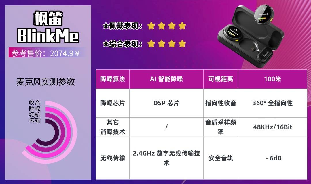 枫笛BlinkMe是一款专业智能旗舰无线麦克风,全触屏操作流畅直观,可快速调整降噪强度、音量档位等核心参数,APP自定义主题还能更换界面风格。6mm全向咪头人声还原度高,音频层次感和空间感突出,适合拍摄纪录片、旅行Vlog等高品质内容;8GB板载内录可存储超15小时音频,安全音轨避免音量过载失真。100米内信号传输延迟低,自带高密度防风毛套,杂音和风噪都能有效压制,但机身重量较重,长时间佩戴有下坠感,且价格偏高,适合重视素材安全和操控便捷性的专业创作者。