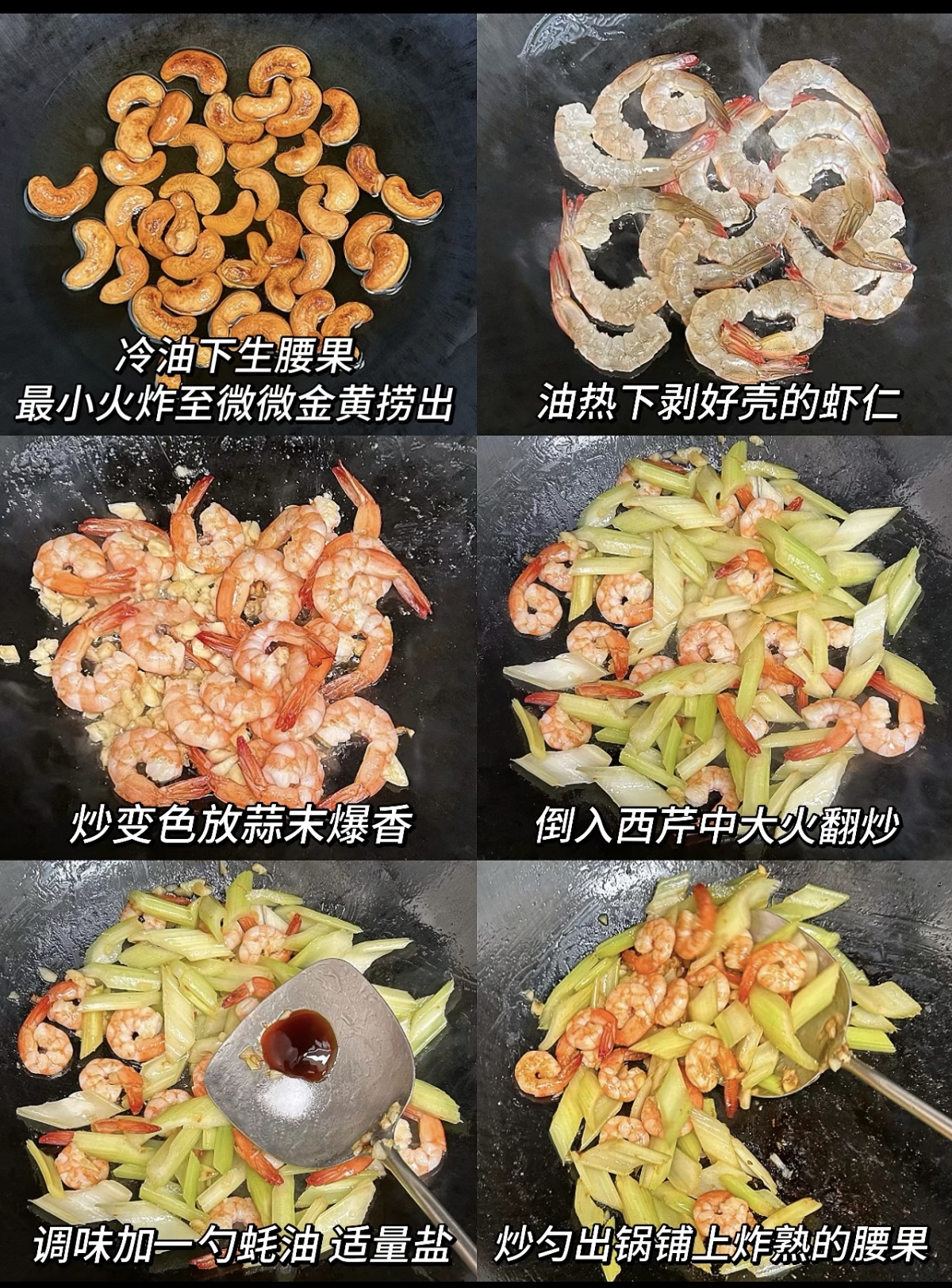 正式烹饪时,锅中留底油,烧至五成热,将腌好的虾仁倒入,快速滑炒至虾仁变色卷曲,呈现出诱人的粉白色,即可盛出备用。锅中再加少许油,爆香几片姜丝,然后将焯好的西芹、红椒等配菜倒入,大火快速翻炒几下。接着,把炒好的虾仁倒回锅中,与西芹一同翻炒均匀。根据个人口味加入适量的盐和少许糖提鲜,如果喜欢,可以淋入一点水淀粉勾个薄芡,让汤汁更好地包裹在食材表面,增添光泽。最后,在出锅前,将晾凉的腰果倒入锅中,快速颠勺翻匀,立刻关火装盘。这一步至关重要,过早放入腰果会使其受热变软,失去酥脆的口感。