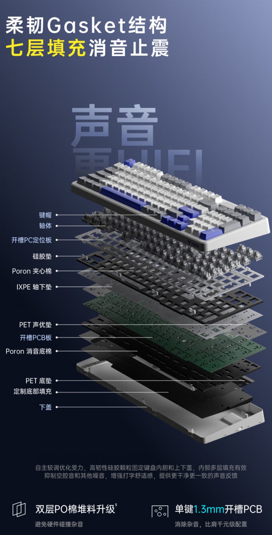 V700DIY-98长续航版键盘全键热拔插无冲突,Gasket 7层消音填充,实现更干净、更纯粹的按键声音,手感更好,声音更HiFi。