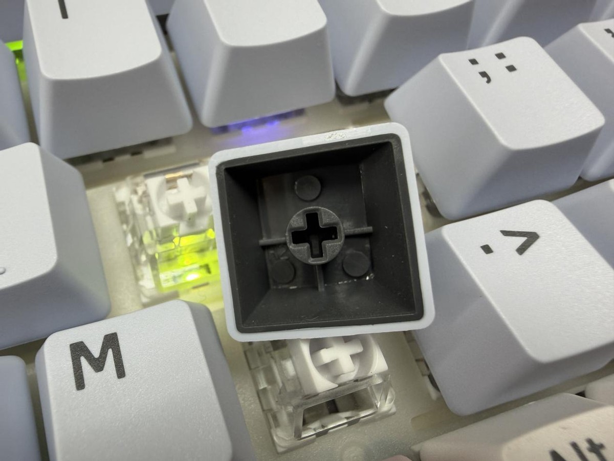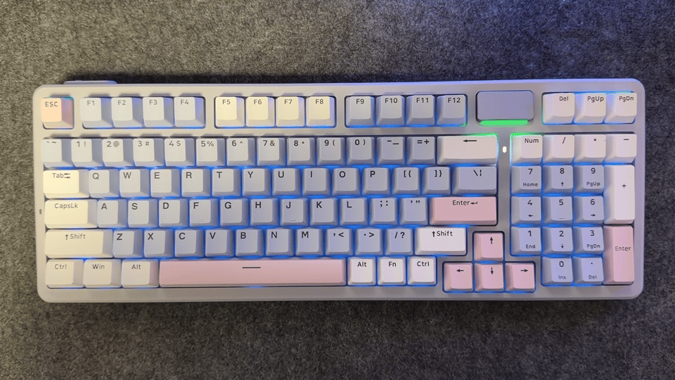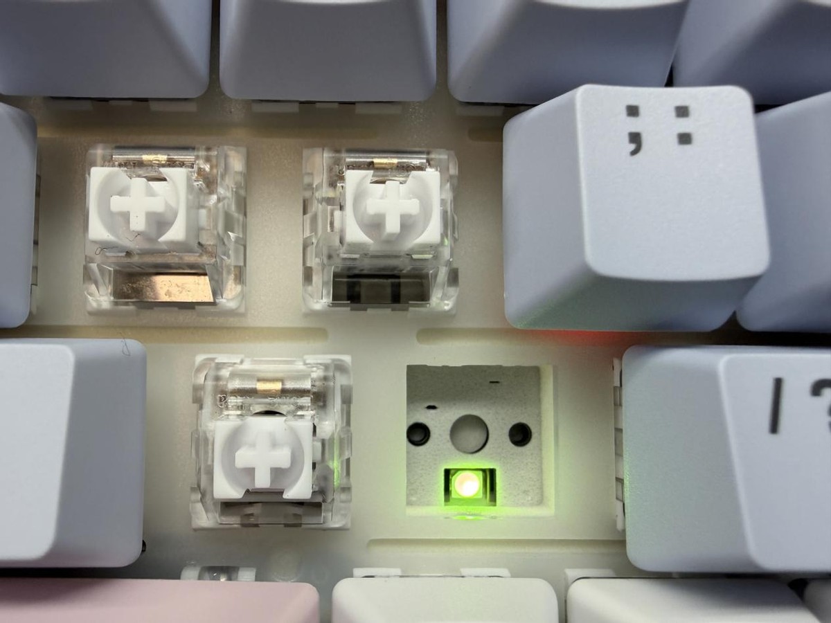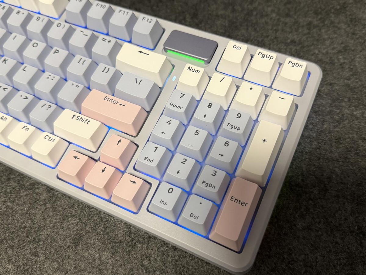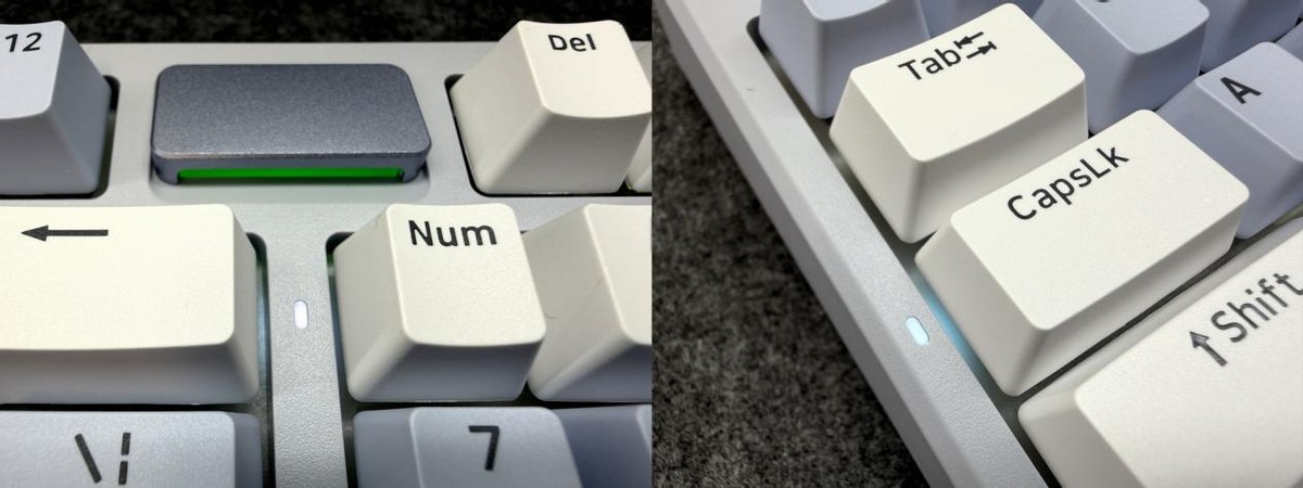 键盘的指示灯设计也是别出心裁,大小写指示灯设计在按键的侧面,按下后灯效会锁定在白色,一目了然。数字锁定指示灯也采用同样的设计,有效节省空间。