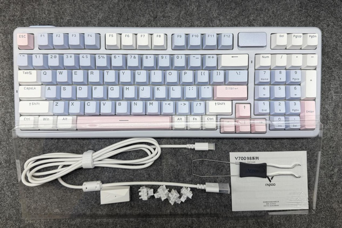 雷柏 V700DIY-98长续航版键盘采用紧凑的 98%配列布局,在保留完整数字小键盘和主要功能键的同时,相比传统的104键键盘长度缩短约 50毫米,为鼠标操作腾出了更多空间,码字游戏,软硬合一。