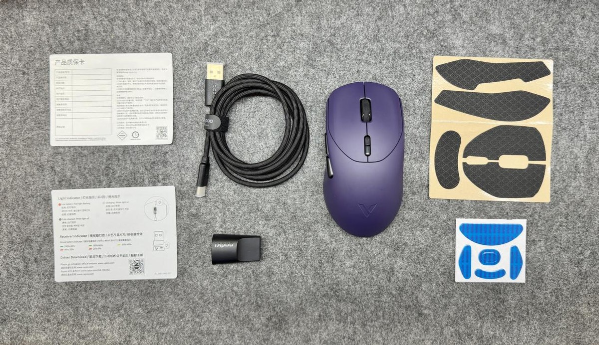 鼠标的配件相当丰富:8K高速传输带屏蔽层的数据线,USB转接器、备用脚贴和防滑垫。