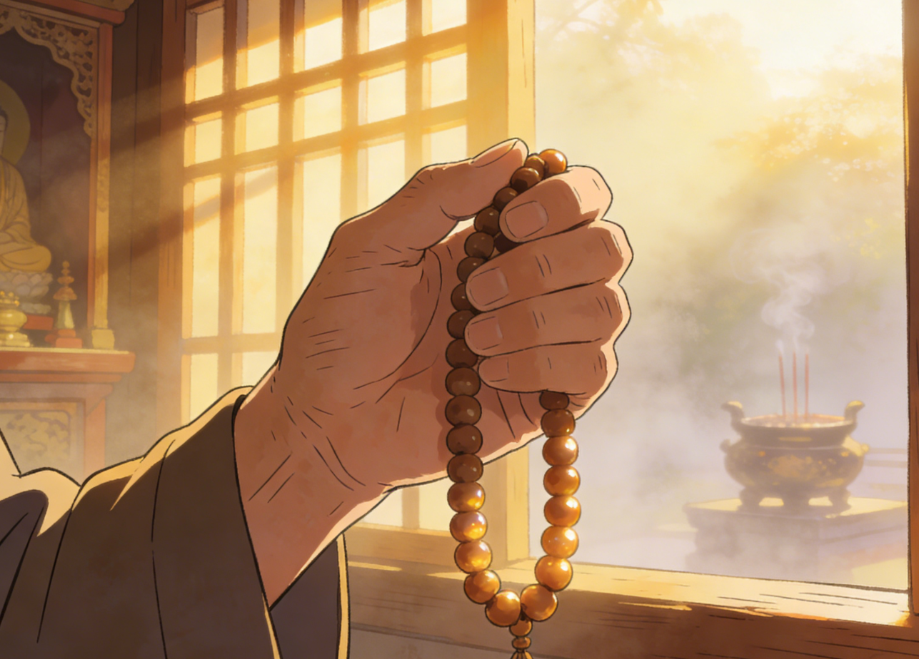 清晨的阳光透过窗棂,老宋轻抚着手中的菩提念珠,开始了他今天的讲述。"诸位善知识,"他的声音温和而有力,"让我们以《晨起发愿文》开启这美好的一天..."