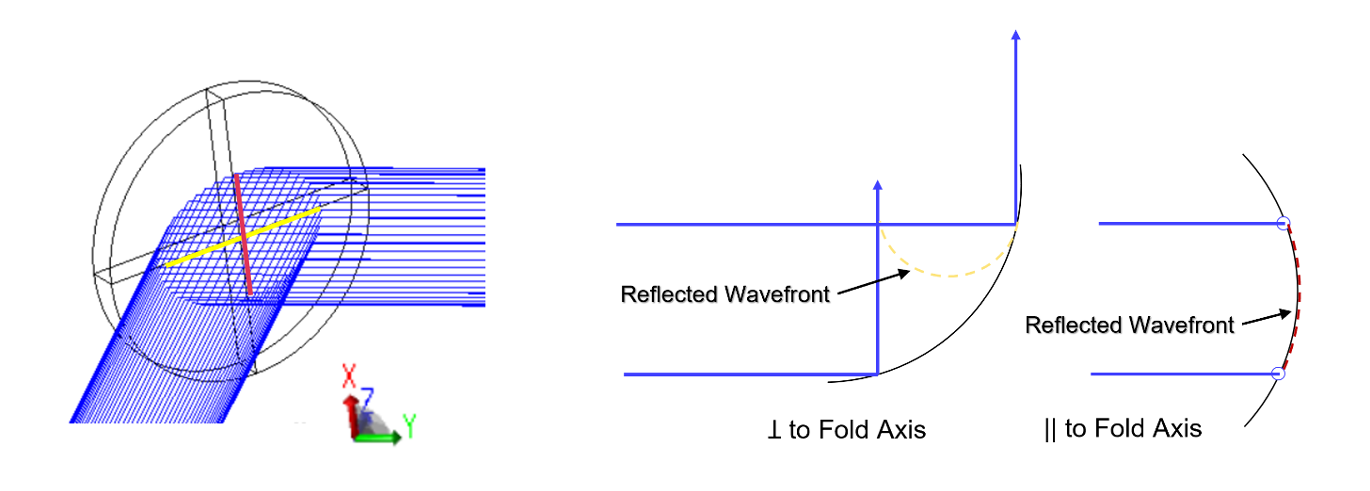 图 1:光束在代表平面度误差的球面上发生 90° 反射的示意图(代表被极度放大的平面度误差)。与折叠轴垂直(ꓕ)的光束轴比与折叠轴平行(||)的光束轴经历更强的反射镜曲率,从而在出射光束中产生像散。