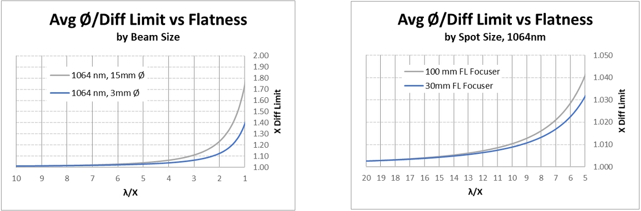 图 3:经过七次反射后,平均光斑直径与衍射极限光斑直径之比(Ø ÷ diffraction limited Ø)随平面度指标变化的关系曲线,左侧按输入光束直径分类,右侧按聚焦光斑尺寸分类。较大的光束需要更大的反射镜;因此,每个系统的绝对反射镜平面度要求是不同的。在这两种情况下,当平面度达到 λ/5 时,误差比接近 1(即接近衍射极限),而在 λ/10 以内实际上已达到衍射极限。在本示例系统中,平面度优于 λ/10 所带来的增益非常小。